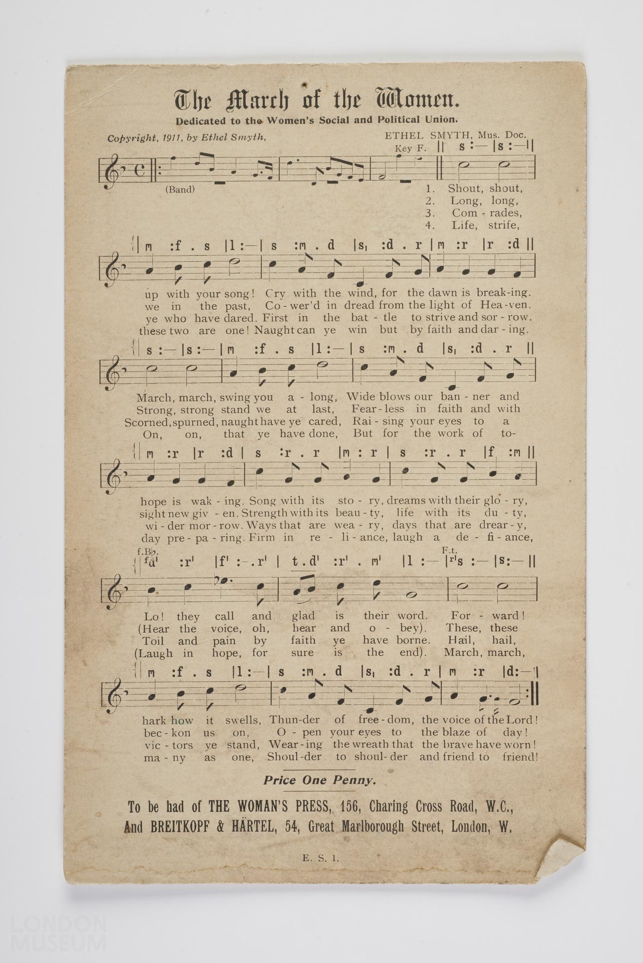 Music score and words for 'The March of the Women' dedicated to the Women's Social and Political Union. Composed by Ethel Smyth 1911. Printed on one side of a vocal card sold for 1d by The Woman's Press. On the reverse of the sheet are printed advertisements for other vocal cards. (Propagandist Songs and Poems).