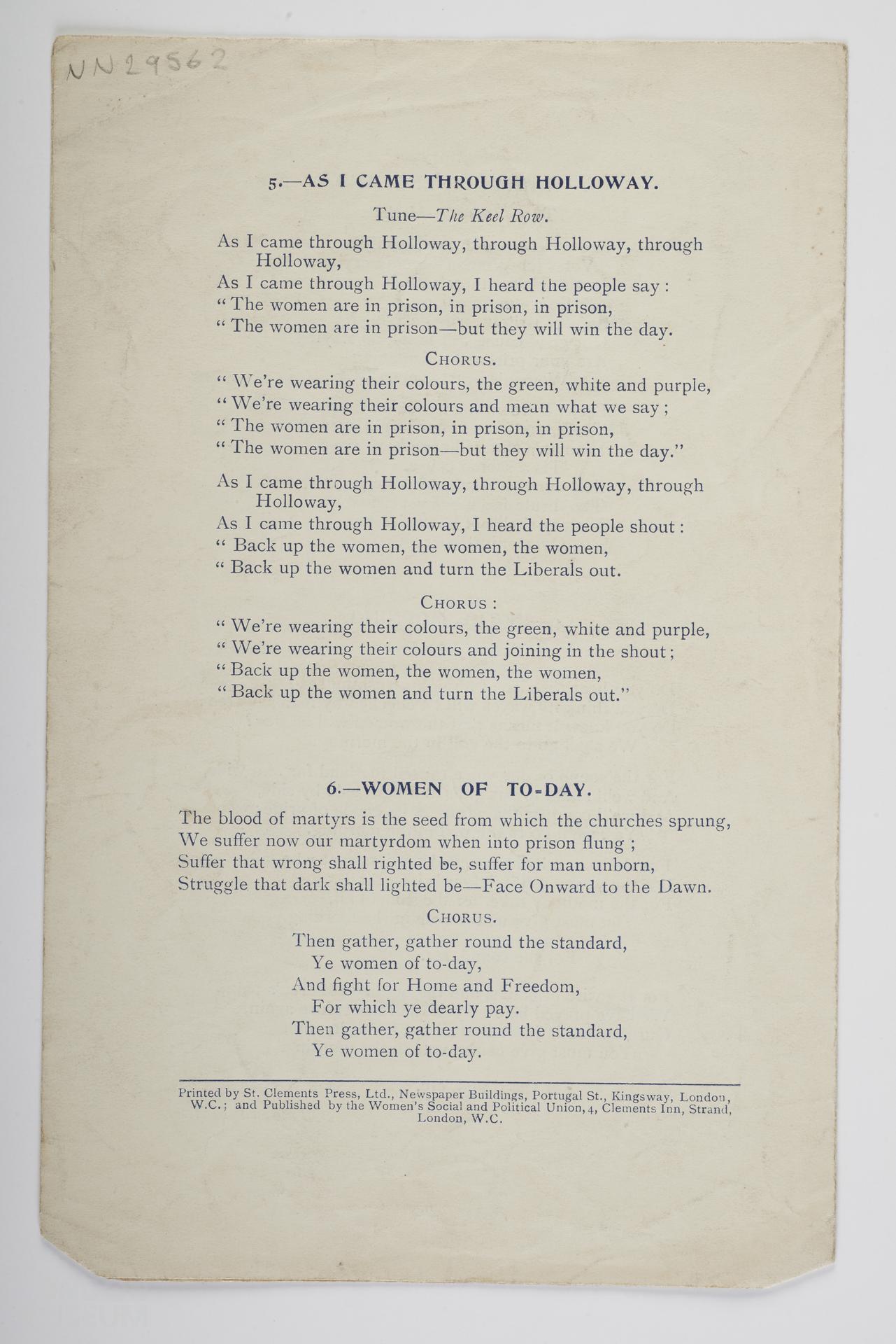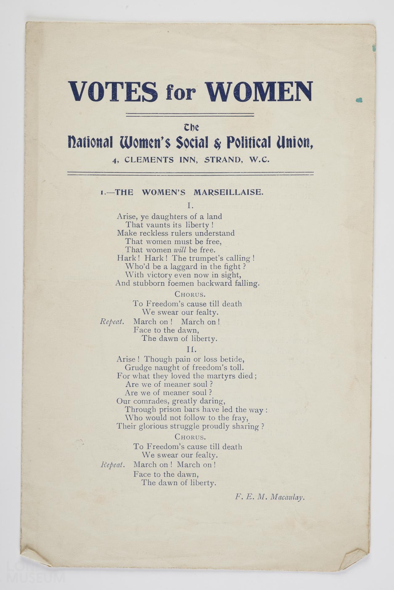 Songsheet 'The Women's Marseillaise', by F.E.M. Macaulay; published by The Women's Social and Political Union; printed by St. Clements Press, Ltd. (Propagandist Songs and Poems).