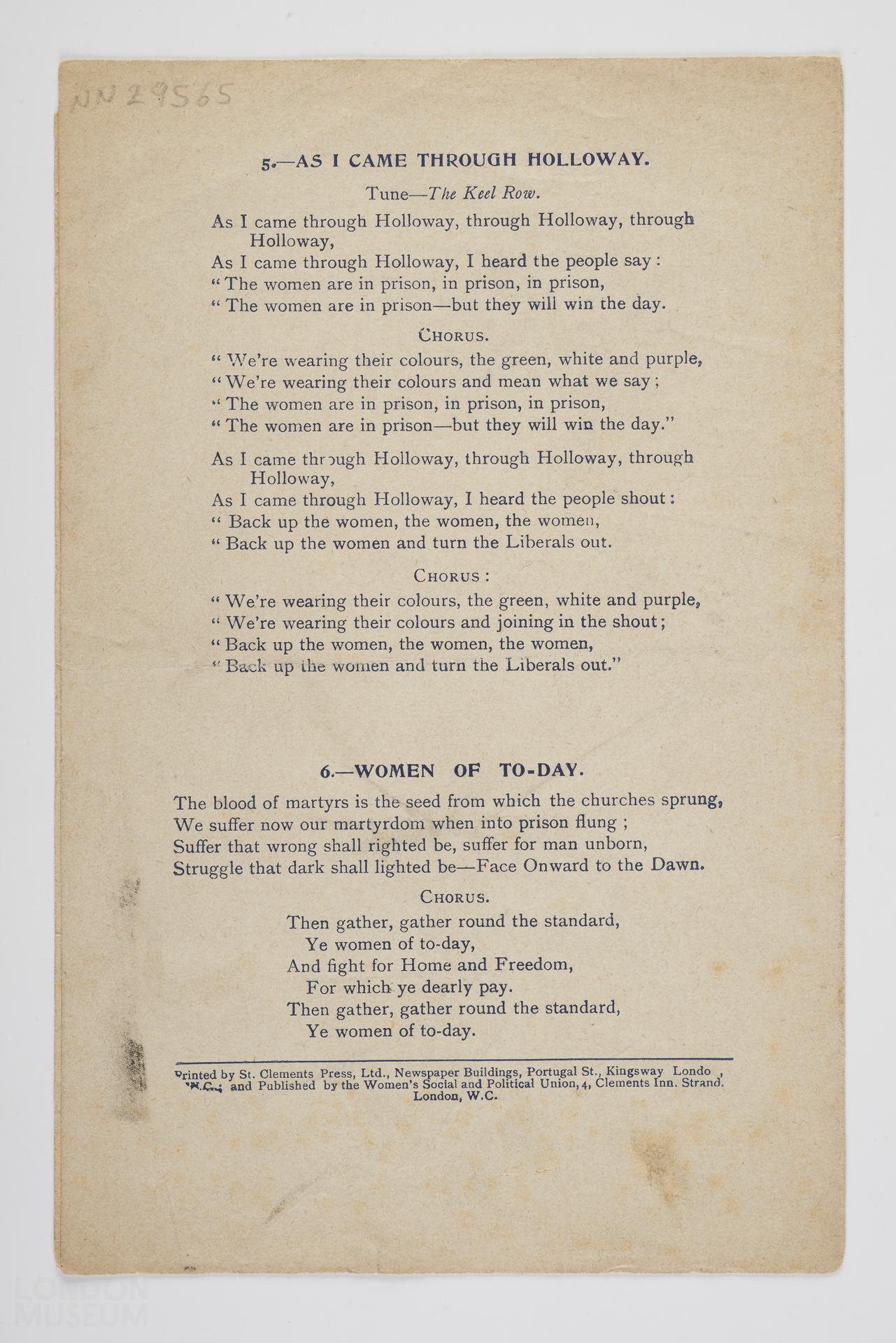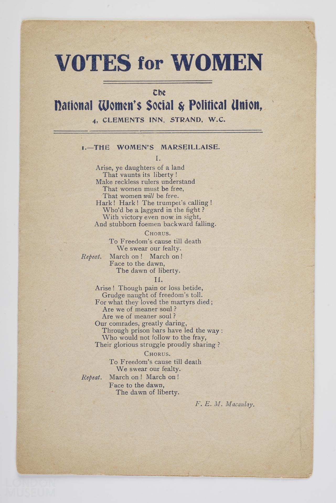 Songsheet 'The Women's Marseillaise', by F.E.M. Macaulay; published by The Women's Social and Political Union; printed by St. Clements Press, Ltd. (Propagandist Songs and Poems).