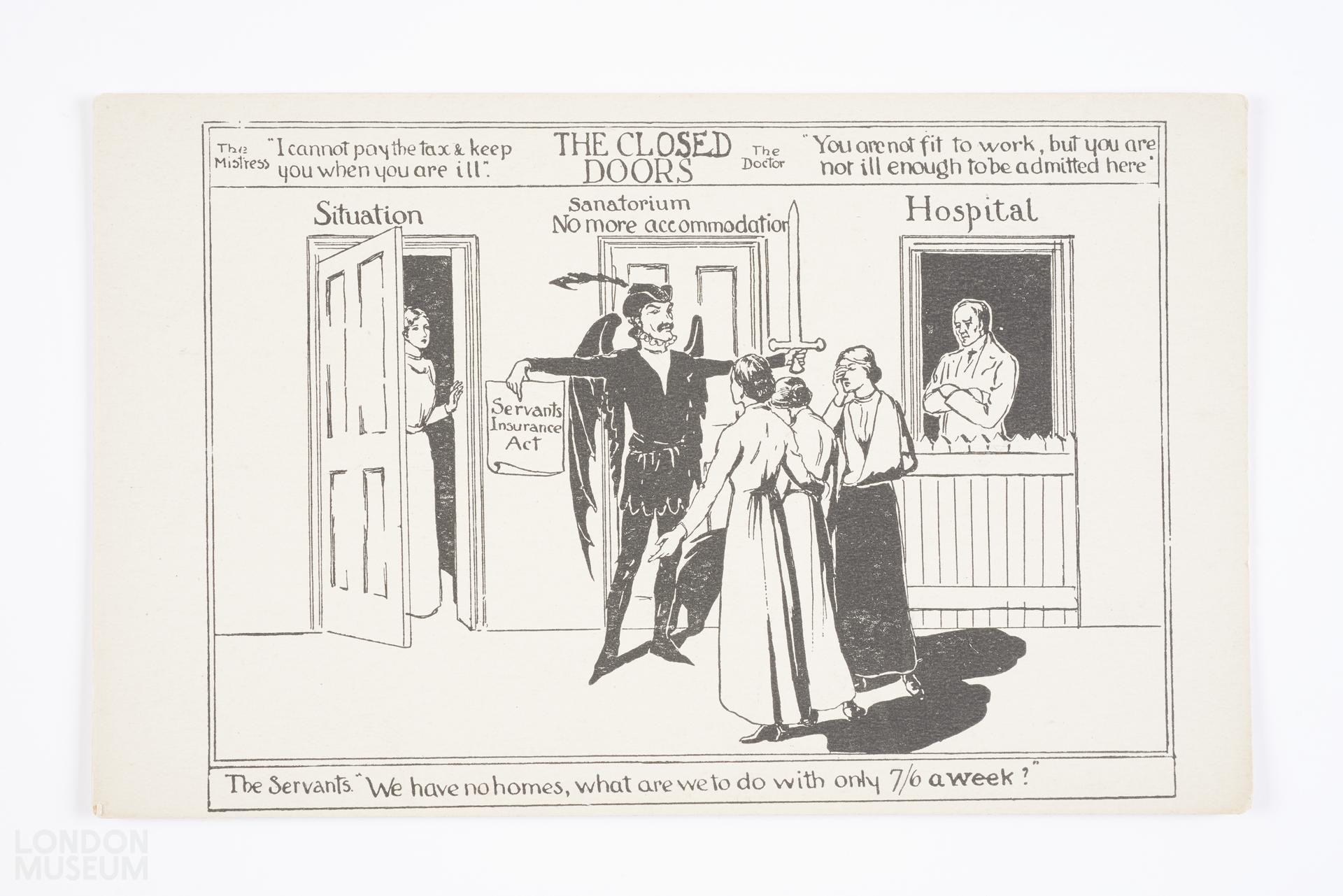 Picture postcard titled "The Closed Doors", showing a winged man holding a sword and a paper entitled "Servants Insurance Act". He stands in front of three women who are distressed. Behind the figure to the left is a woman in a doorway with "Situation" written above it, and the caption: "The Mistress 'I cannot pay the tax & keep you when you are ill' ". Immediately behind the winged figure is a doorway, above which reads "Sanatorium. No more accommodation"". To the right of the figure is a doorway with a man standing in it, above which is written "Hospital" and the caption: "The Doctor 'You are not fit to work, but you are not ill enough to be admitted here' ". At the bottom of the postcard is written "The Servants 'We have no homes, what are we to do with only 7/6 a week?".