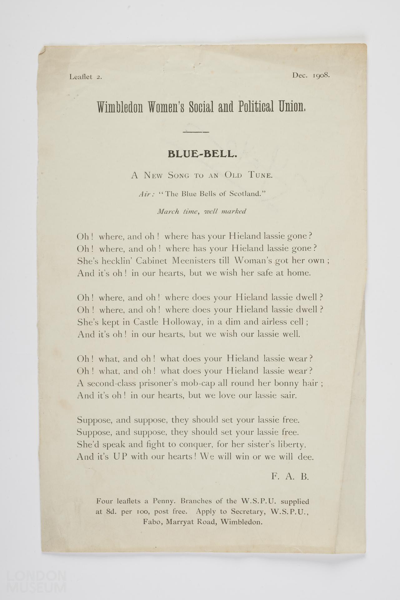 Words for the suffragette marching song 'Blue-Bell'. Printed on one side of a sheet of paper. Published by Wimbledon Women's Social and Political Union, December 1908. (Propagandist Songs and Poems). Part of the collection of objects relating to the Suffragette Movement, given by the Suffragette Fellowship, 1950. 'Mrs Yates' written in pencil on the reverse.