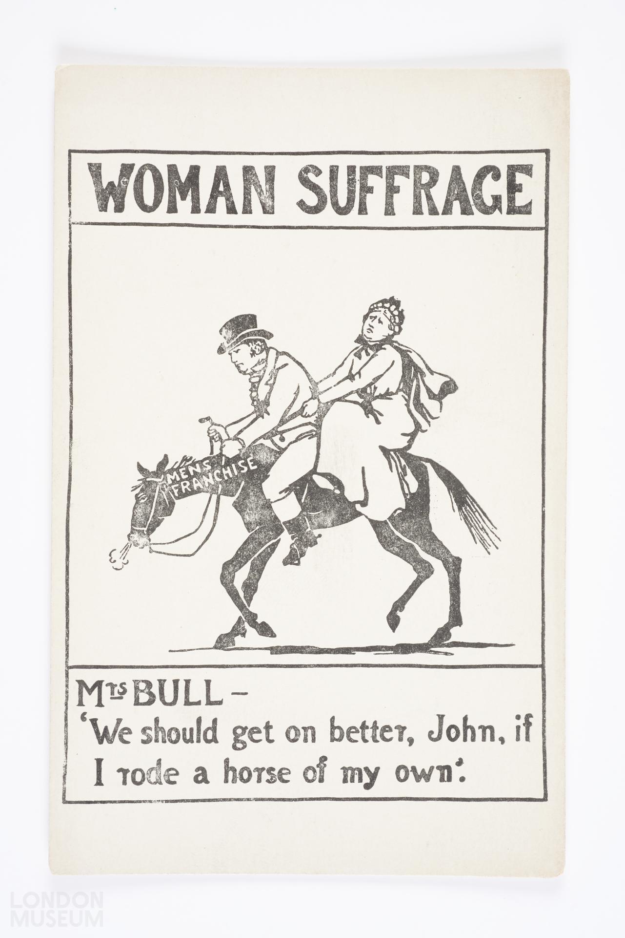 Picture postcard showing a woman and a man riding a horse with "Mens franchise" written on it. Below is written "Mrs Bull- 'We should get on better, John, if I rode a horse of my own' ".
