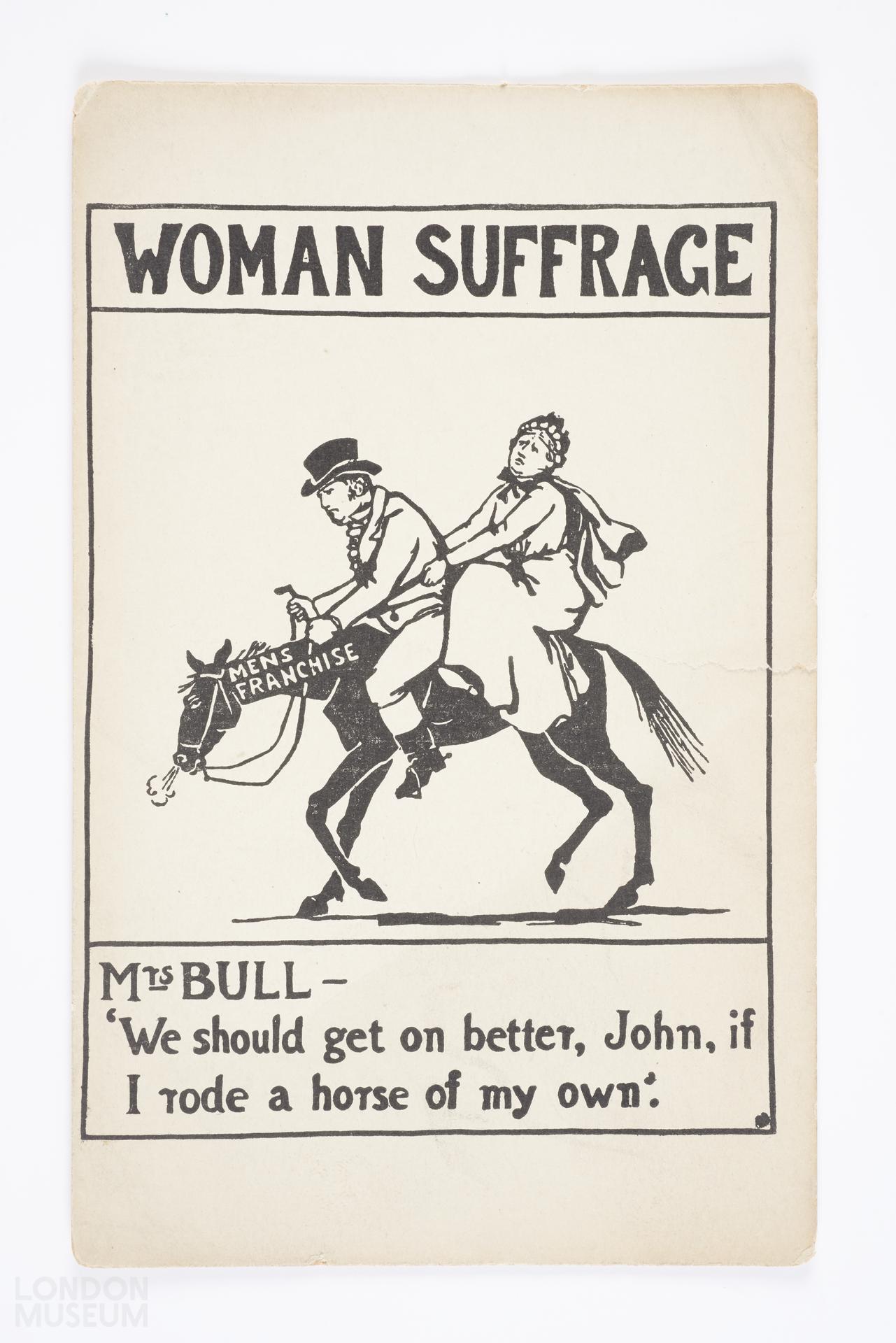 Picture postcard showing a woman and a man riding a horse with "Mens franchise" written on it. Below is written "Mrs Bull- 'We should get on better, John, if I rode a horse of my own' ".