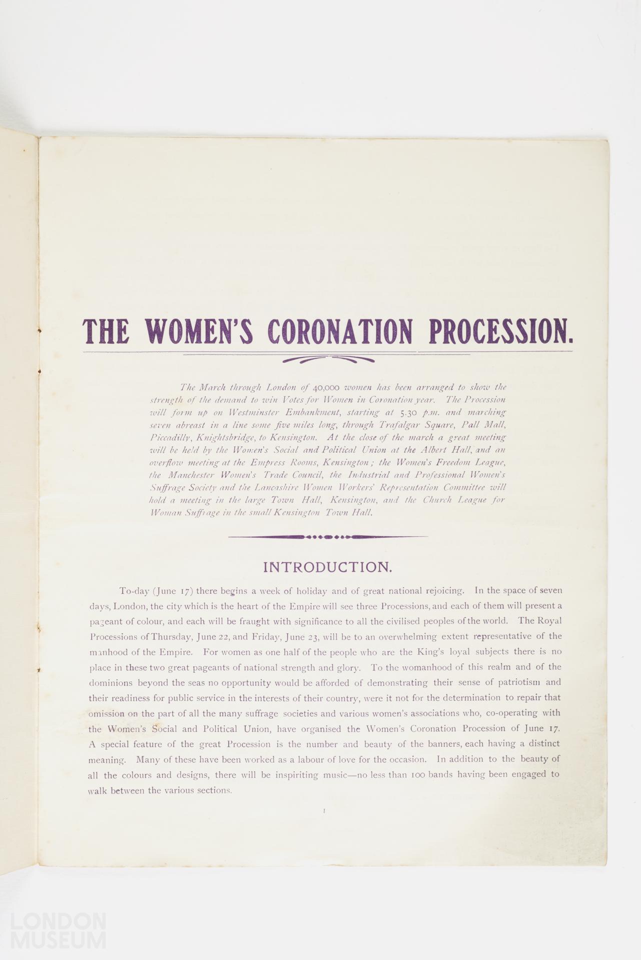 Souvenir Programme of the 'Women's Coronation Procession to Demand Votes for Women. Order of March and Descriptive Programme', Saturday 17th June 1911. The eight page programme was priced 4d. There is an order of march leaflet attached in the central page of the programme.