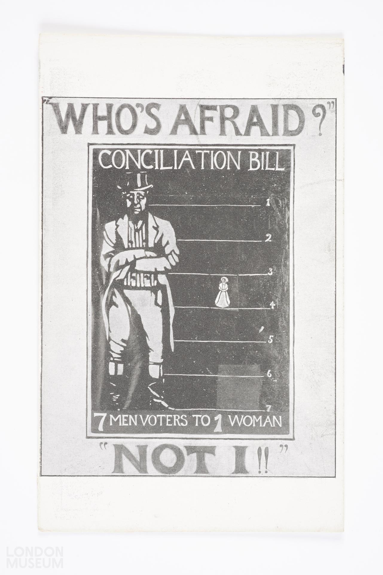 Picture postcard titled "Who's Afraid?" "Not I!!" with a drawing which illustrates the Conciliation Bill situation of there being 7 male voters to one female voter.
