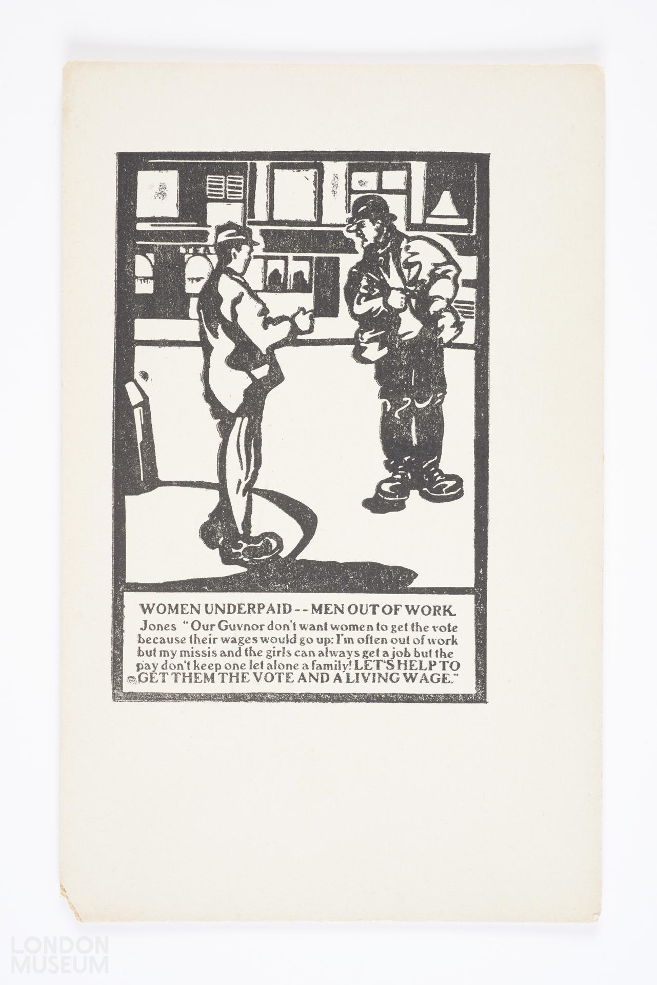 Picture postcard titled "Women underpaid - men out of work", with an illustration of two men on a street. The text printed below reads: "Jones 'Our Guvnor don't want women to get the vote because their wages would go up. I'm often out of work but my missis and the girls can always get a job but the pay don't keep one let alone a family! LET'S HELP TO GET THEM THE VOTE AND A LIVING WAGE'."