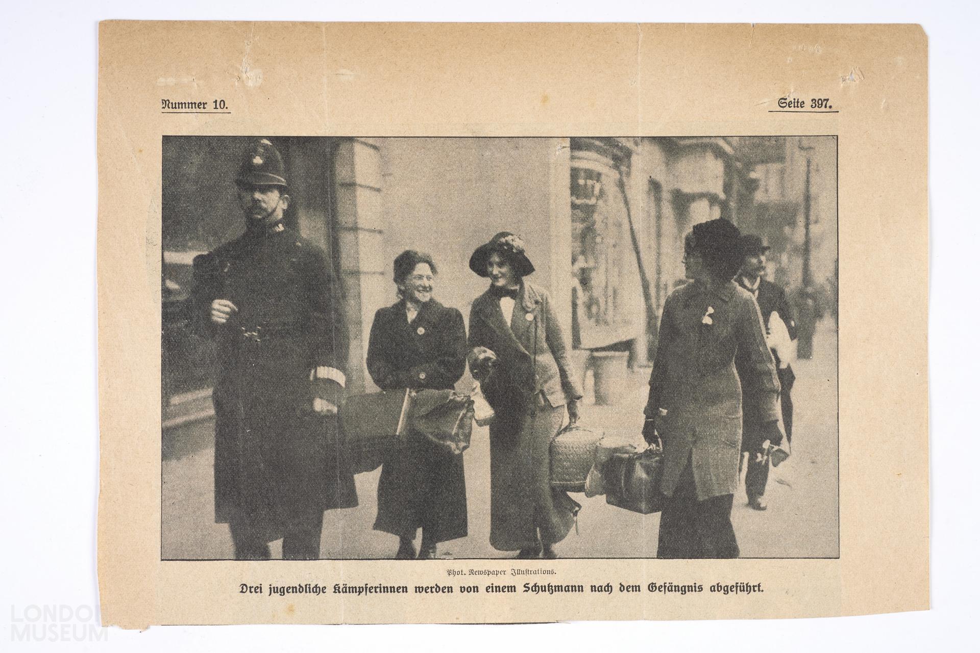 Illustrated newspaper cutting captioned 'Drei jugenblide kämpferinnen werden von einem Schukmann nadj dem Gefängnis abgeführt.'
