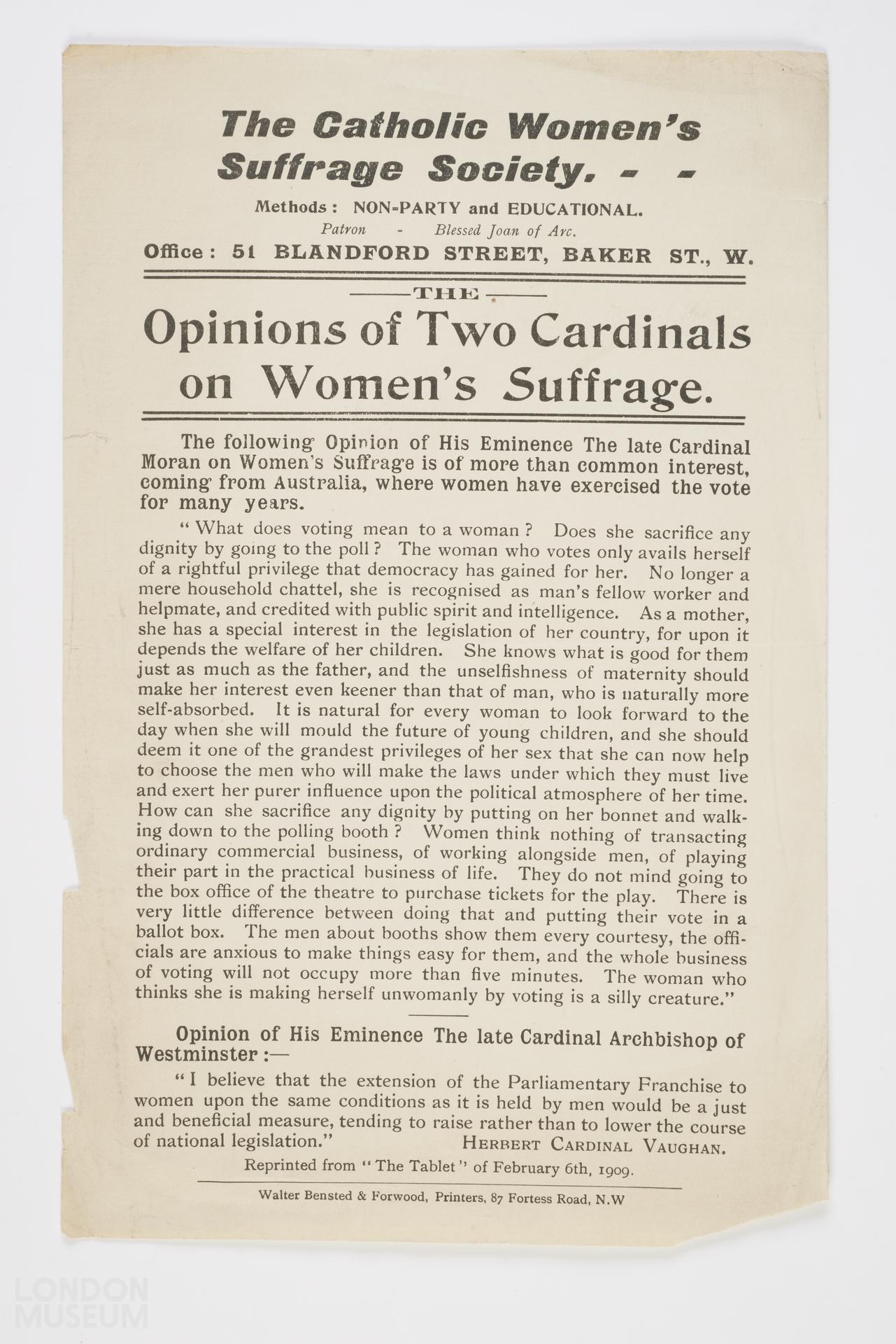 Single sided single sheet leaflet entitled 'The Opinions of Two Cardinals on Women's Suffrage'. A non-party educational leaflet.