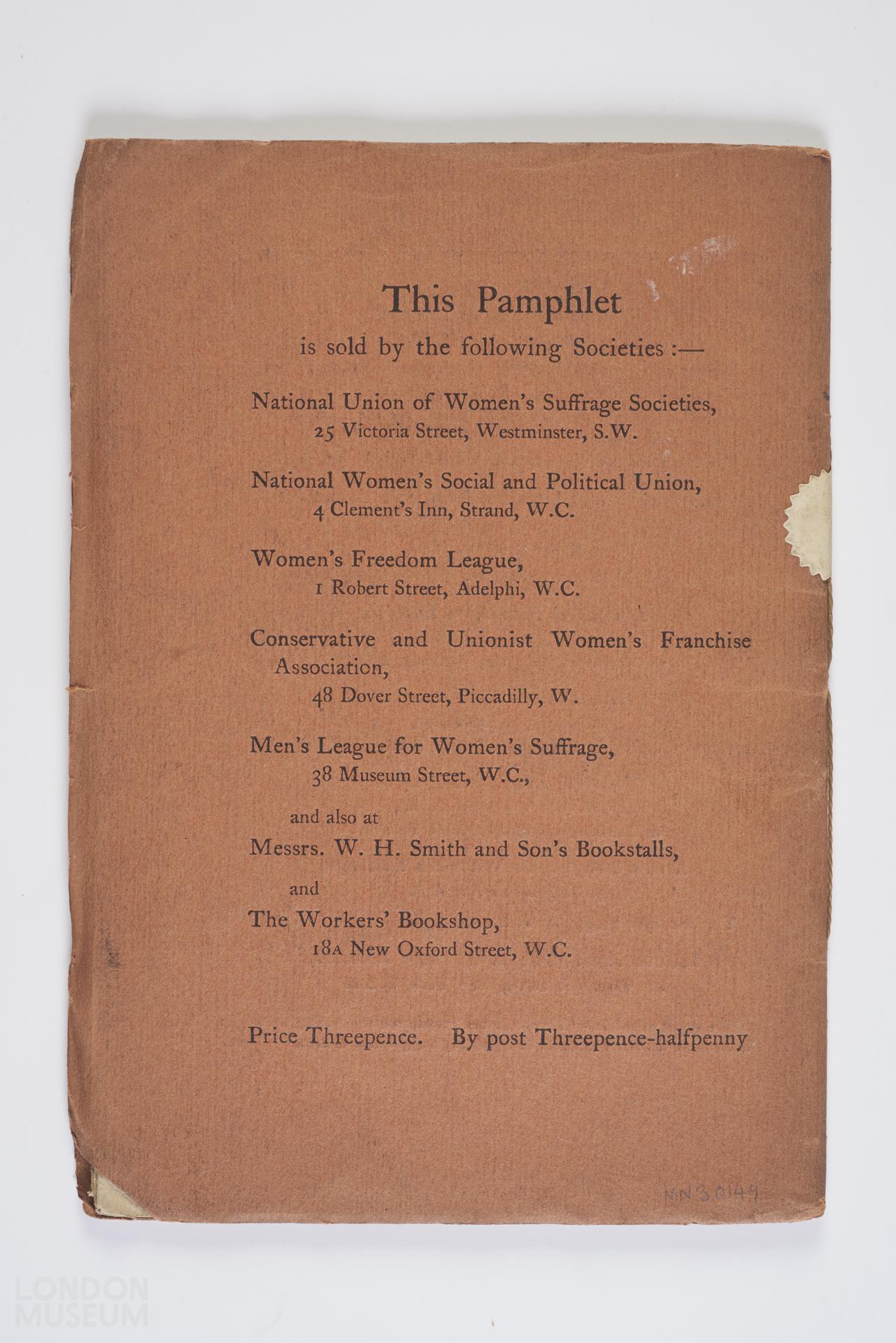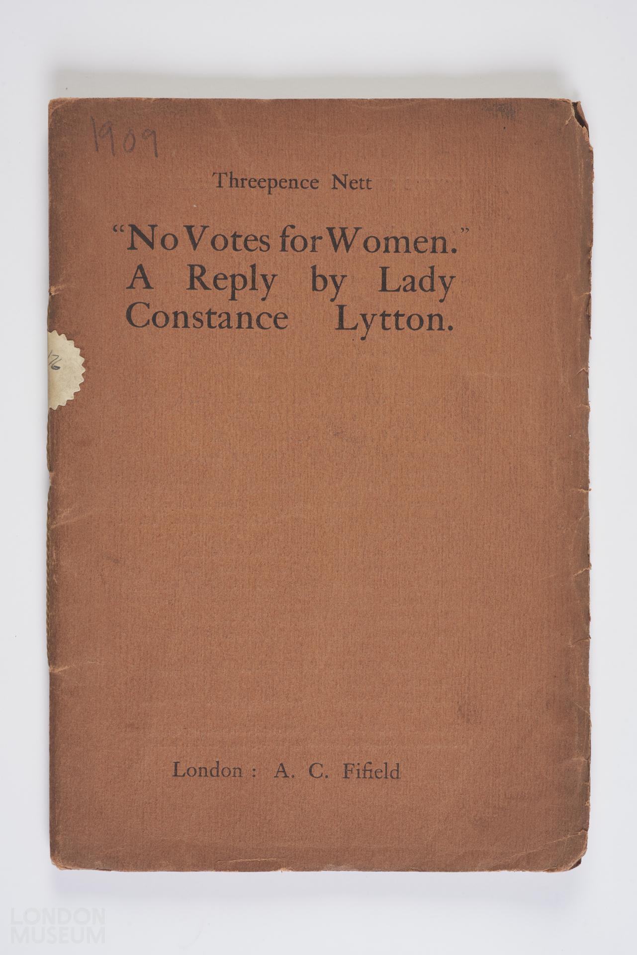Booklet titled 'No votes for women a reply to some recent anti-suffrage publications' by Lady Constance Lytton, pp32. In the pamphlet the author codifies the anti-suffragists arguments against women's suffrage and then refutes them. The back cover lists societies and book retailers selling the booklet. The inside cover lists a number of pro-suffrage organisations.