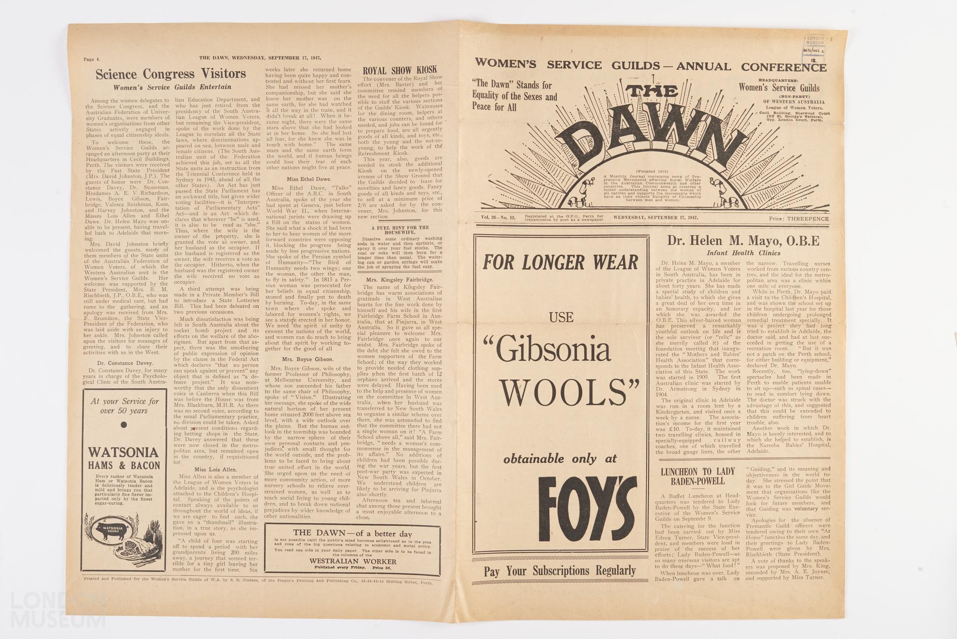 Copy of The Dawn, dated Wednesday September 17, 1947. Part of the collection of objects relating to the Suffragette Movement, given by the Suffragette Fellowship, 1950.