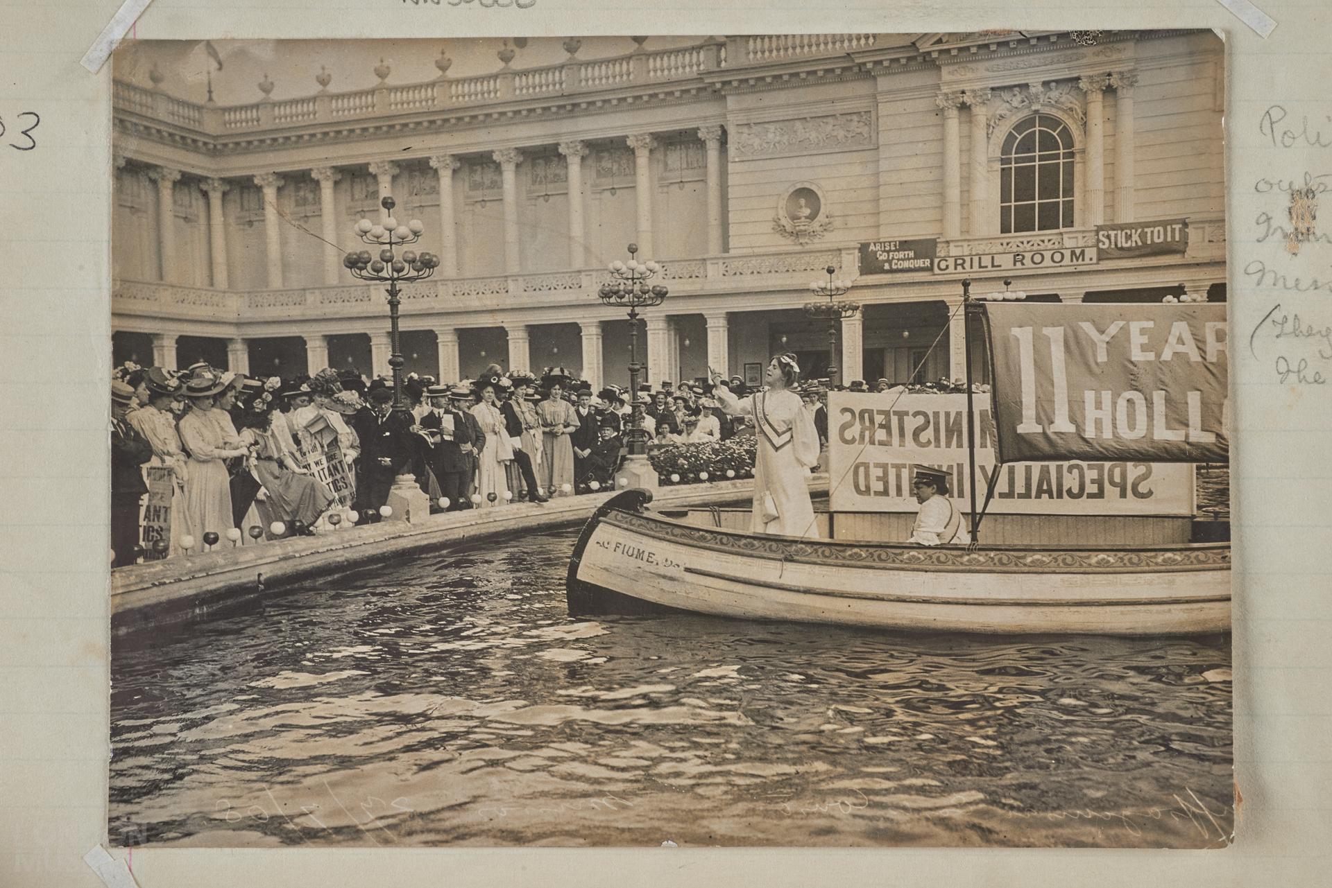 Black and white photograph of a suffragette on a barge, pencil note reads, ' Police watching outside Clements Inn for Mrs and Miss C Pankhurst, there even on the roof garden'.