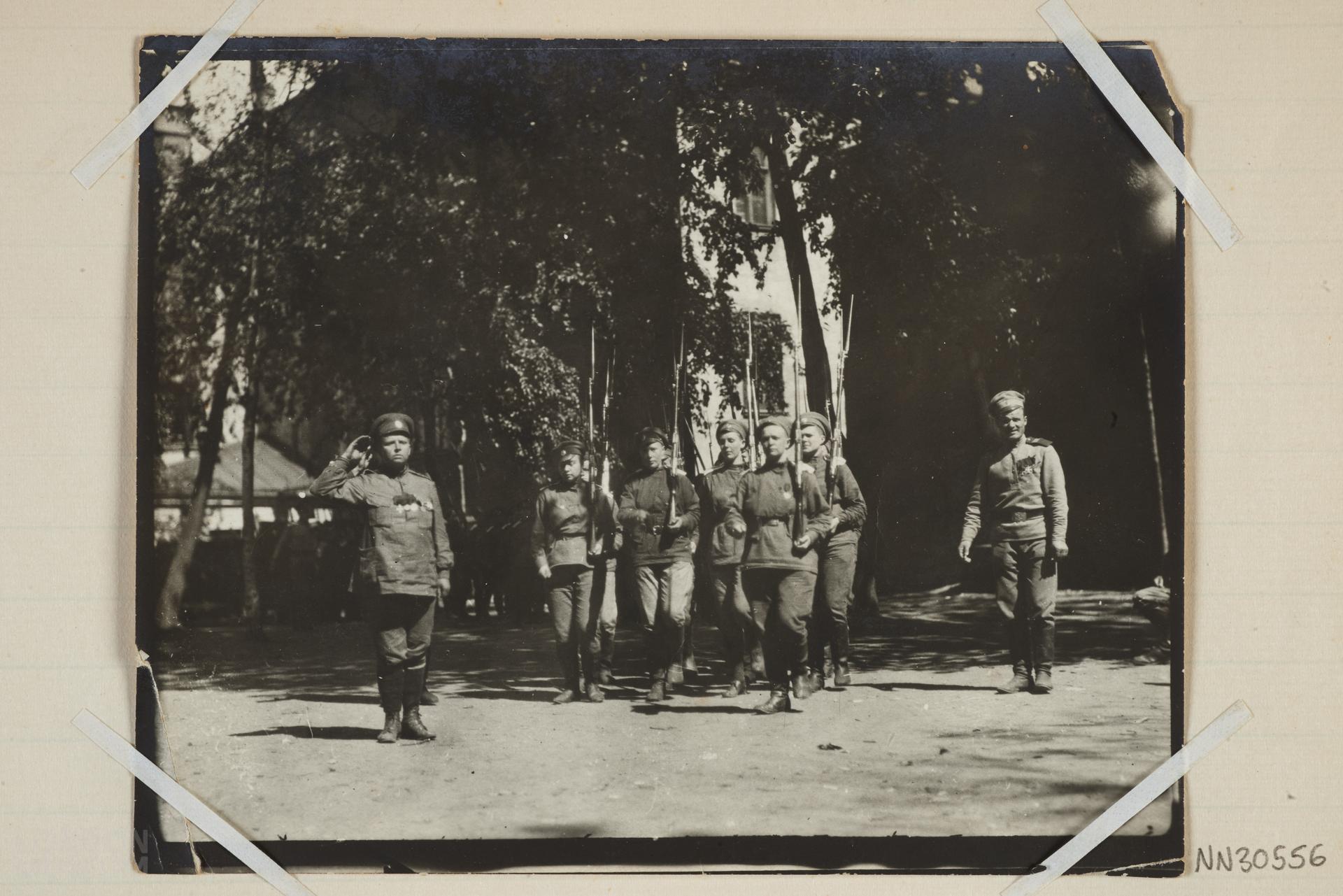 Photograph depicting a group of Russian soldiers. The image relates to Emmeline Pankhurst's visit to Russia from June-October 1917 to encourage Russian women to support the war. She was present during the October Revolution.