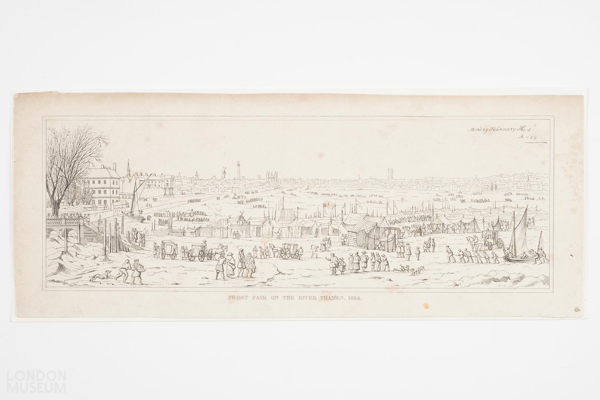 View of a Frost Fair on the Thames on 'Monday February the 4th 1684'. Depiction of crowds, tents, fires and a horse and carriage on the ice.