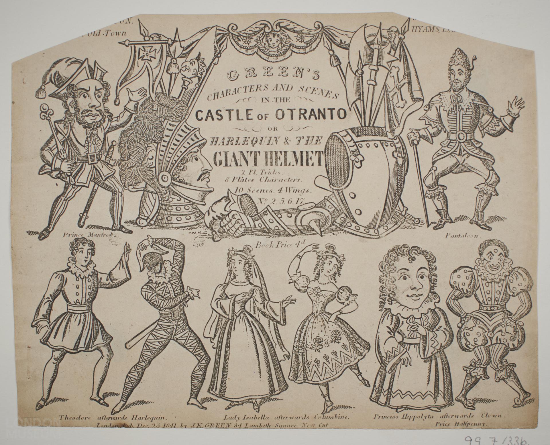 Toy theatre character title sheet relating to the play 'Castle of Otranto or Harlequin and the Giant Helmet', '2 Pl. Tricks, 8 Plates Characters, 10 Scenes, 4 Wings, No. 2, 5, 6, 17'. Published by J.K. Green, 34 Lambeth Square, New Cut, London and sold by J. Redington, 208 Hoxton Old Town. Sold wholesale by Moss Hyams, 15 Mint St, Borough.