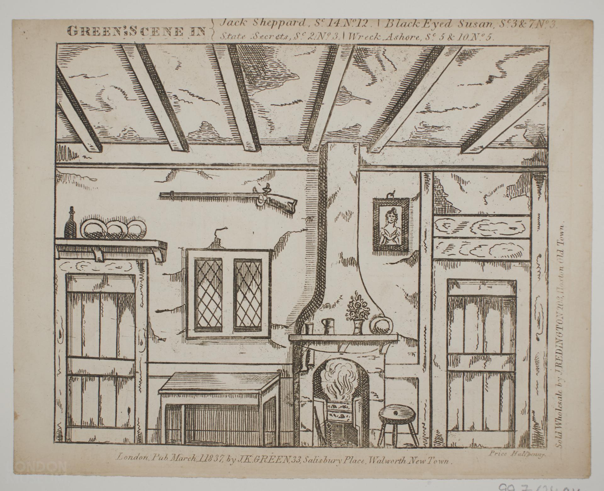 Toy theatre scenery sheet relating to the play 'Jack Sheppard'. Scene 14, No. 12. Published by John Kirby Green and sold by John Redington, 208 Hoxton Old Town.