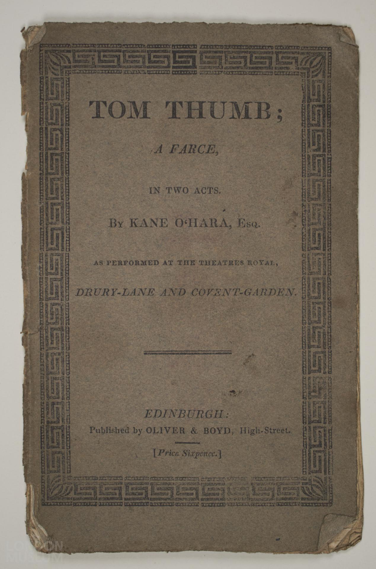 Toy theatre playbook titled: Tom Thumb, a Farce, in Two Acts by Kane O'Hara, published and printed by Oliver and Boyd, High-Street, Edinburgh.