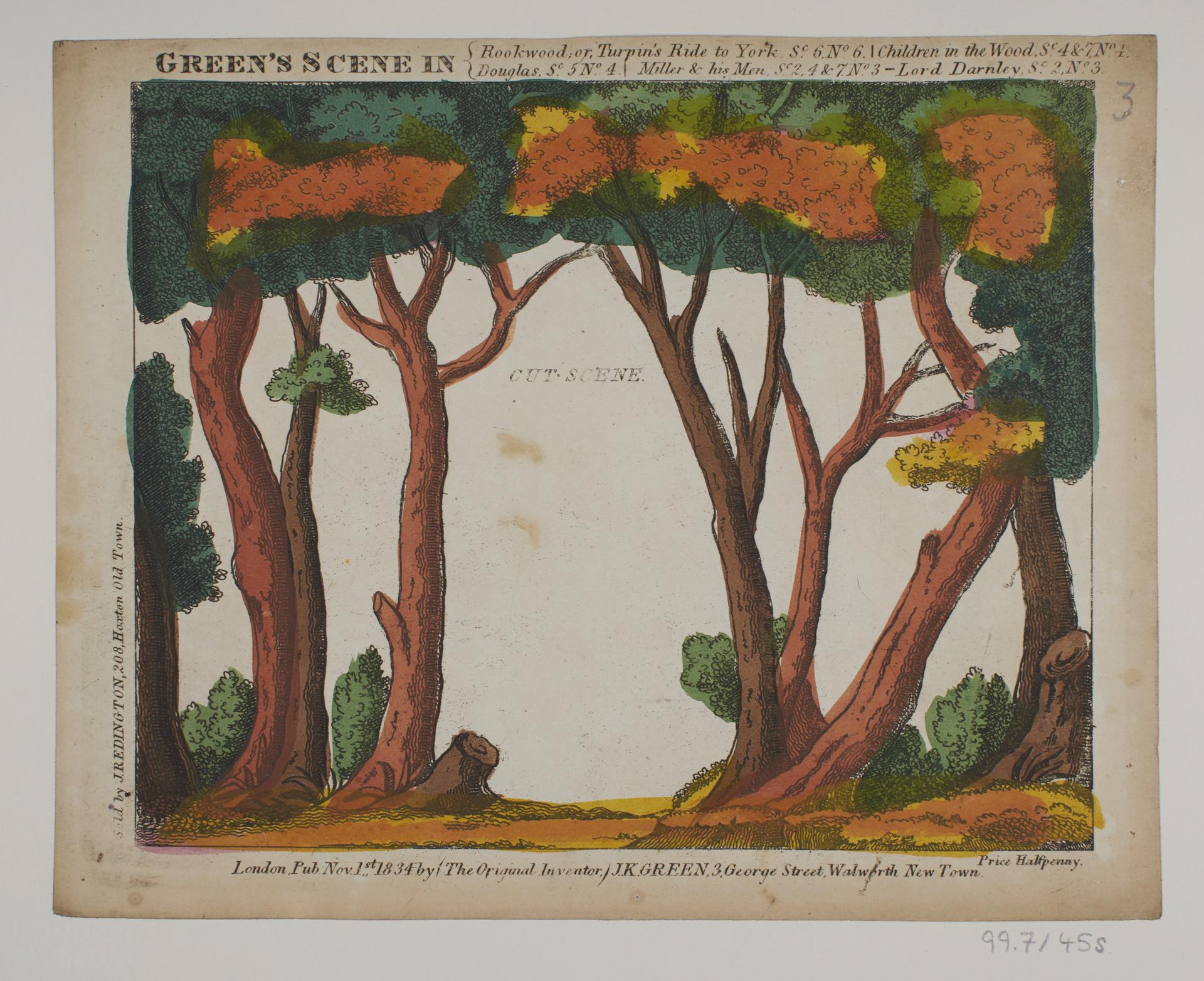 Colour toy theatre scenery sheet relating to the play 'Douglas', Sc. 5, No. 4, and four other plays. Published by John Kirby Green, 3 George Street, Walworth, New Town, and sold by J. Redington, 208 Hoxton Old Town.