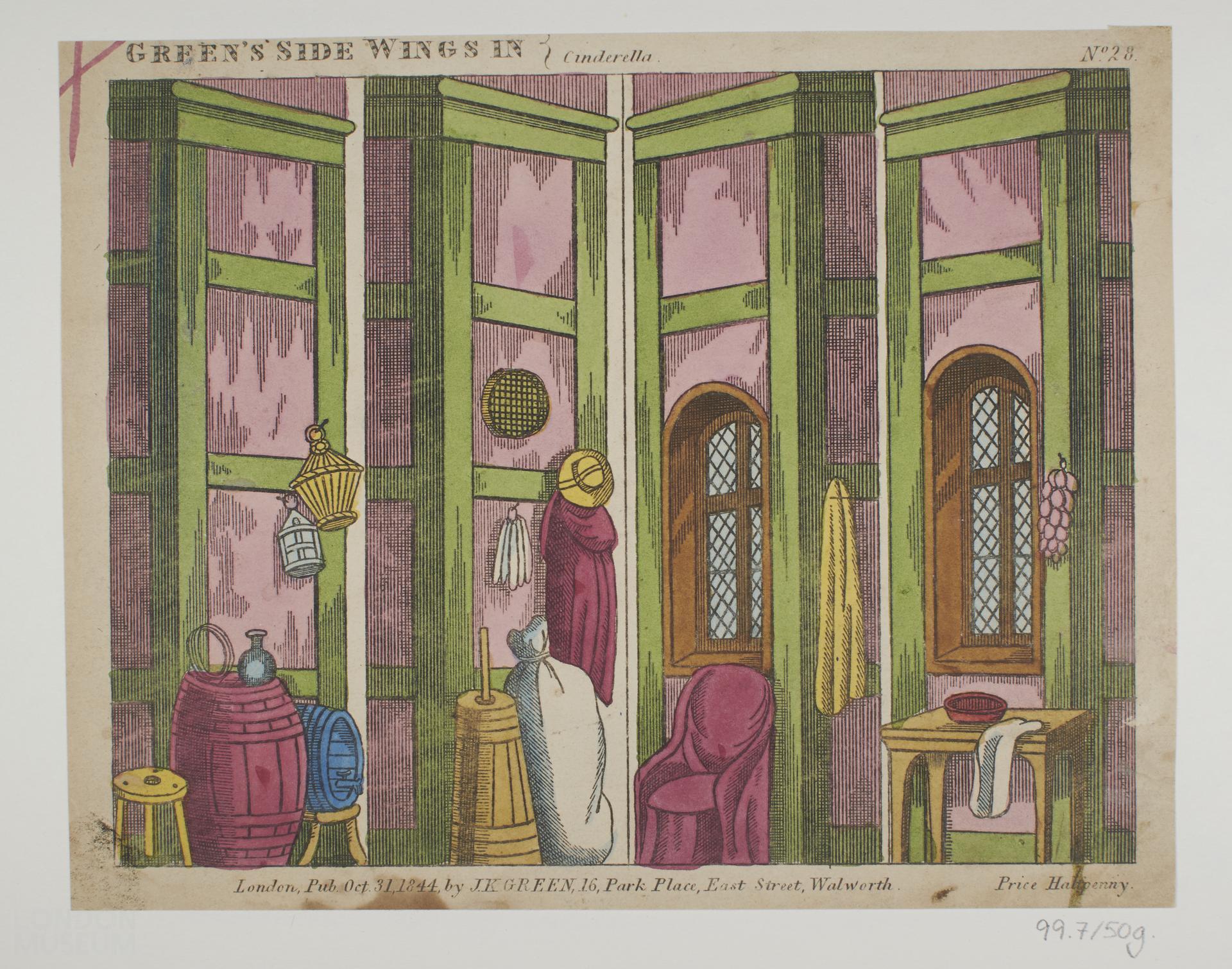 Coloured toy theatre scenery sheet relating to the play 'Cinderella'. Published by John Kirby Green, 16 Park Place, East Street, Walworth.