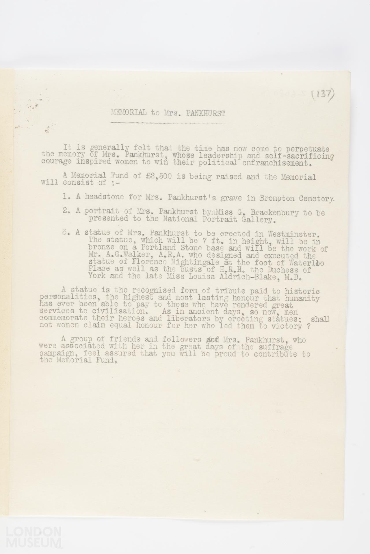 One statement or speech, from a collection of papers relating to the Emmeline Pankhurst memorial fund. Includes cuttings, leaflets, fund raising forms and details of the unveiling of her memorial statue.