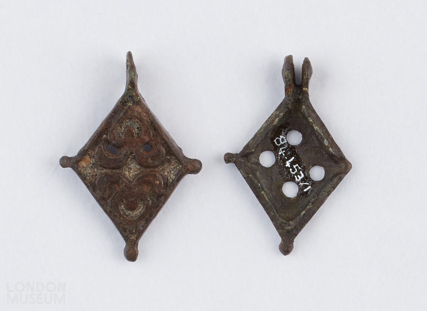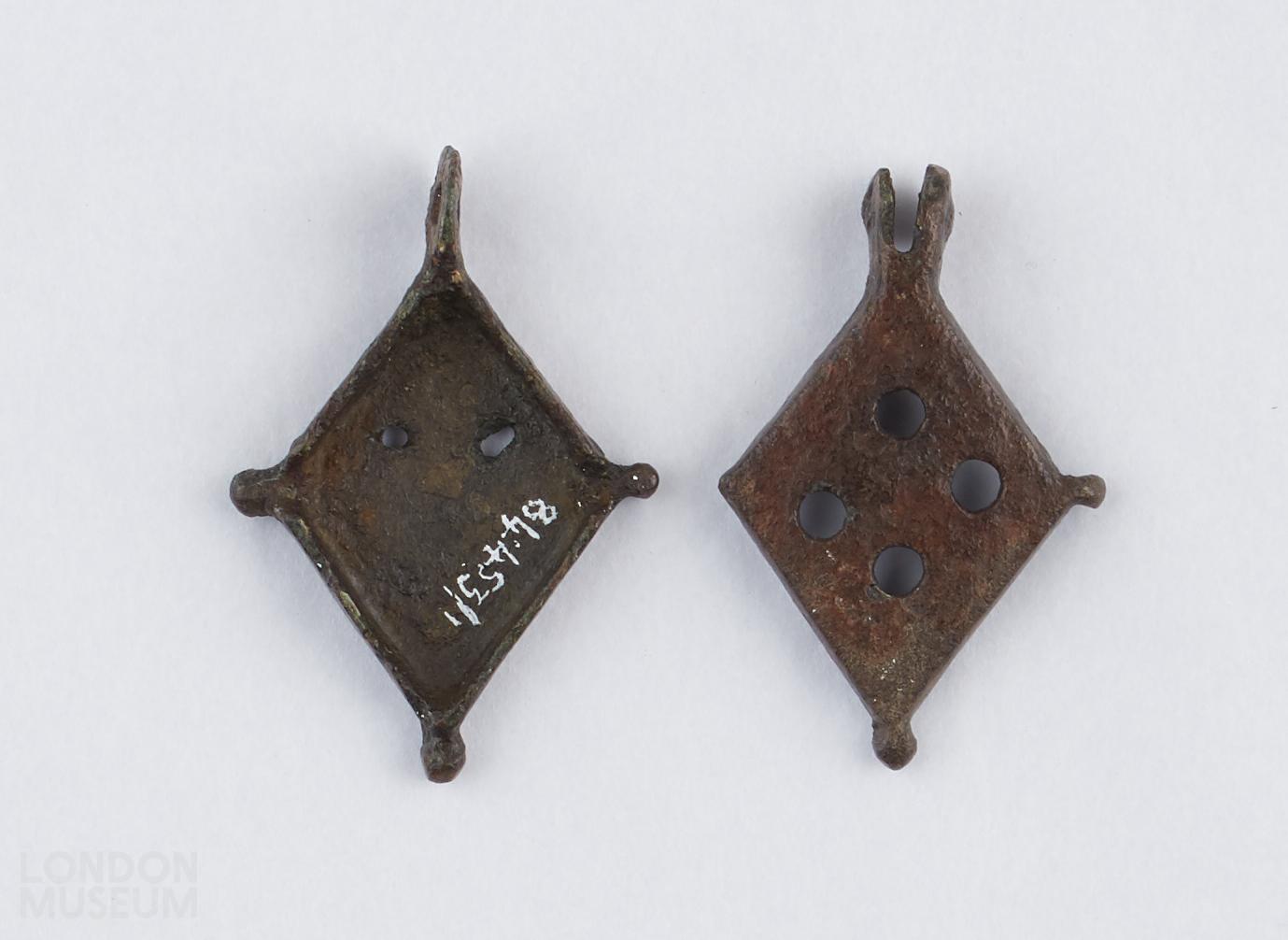 Seal box, copper alloy, top and base separated; lozenge/diamond shape; the top has slight damage/corrosion - two holes are present; two decorations over the top, no inlaid enamel; base has four perforations, irregularly spaced, but following the four corners.