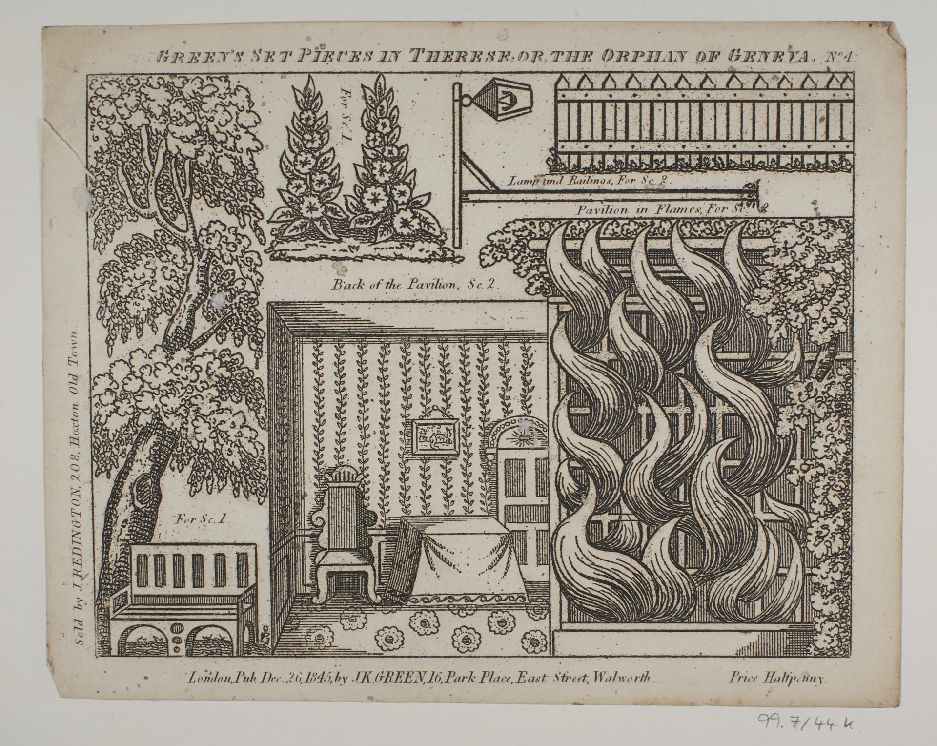 Toy theatre scenery sheet relating to the play 'Therese, or the Orphan of Geneva', No. 4. Published by John Kirby Green, 16 Park Place, East Street, Walworth and sold by J. Redington, 208 Hoxton Old Town.