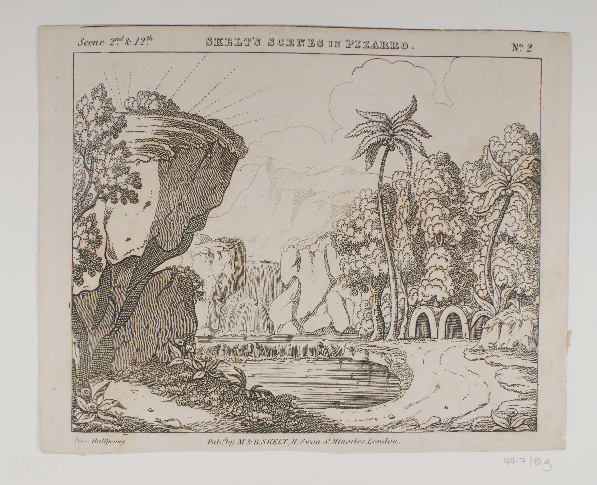 Toy theatre scenery sheet relating to the play 'Pizarro', No. 2. Scene 2nd & 12th. Published by M & B. Skelt, 11 Swan St, Minories, London and sold for 1/2d each.