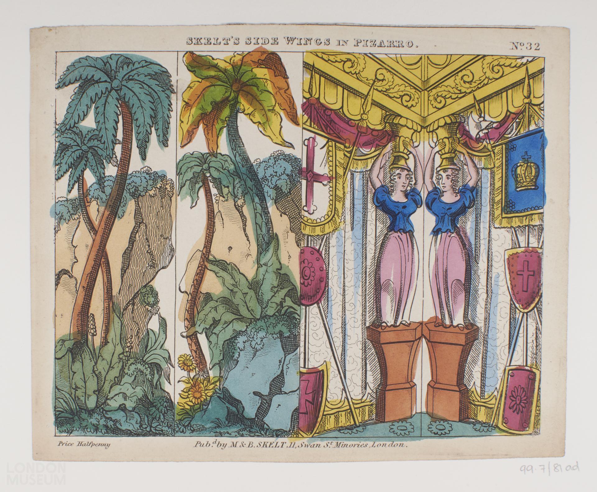 Coloured toy theatre scenery sheet relating to the play 'Pizarro', No. 32. Published by M & B. Skelt, 11 Swan St, Minories, London and sold for 1/2d each.