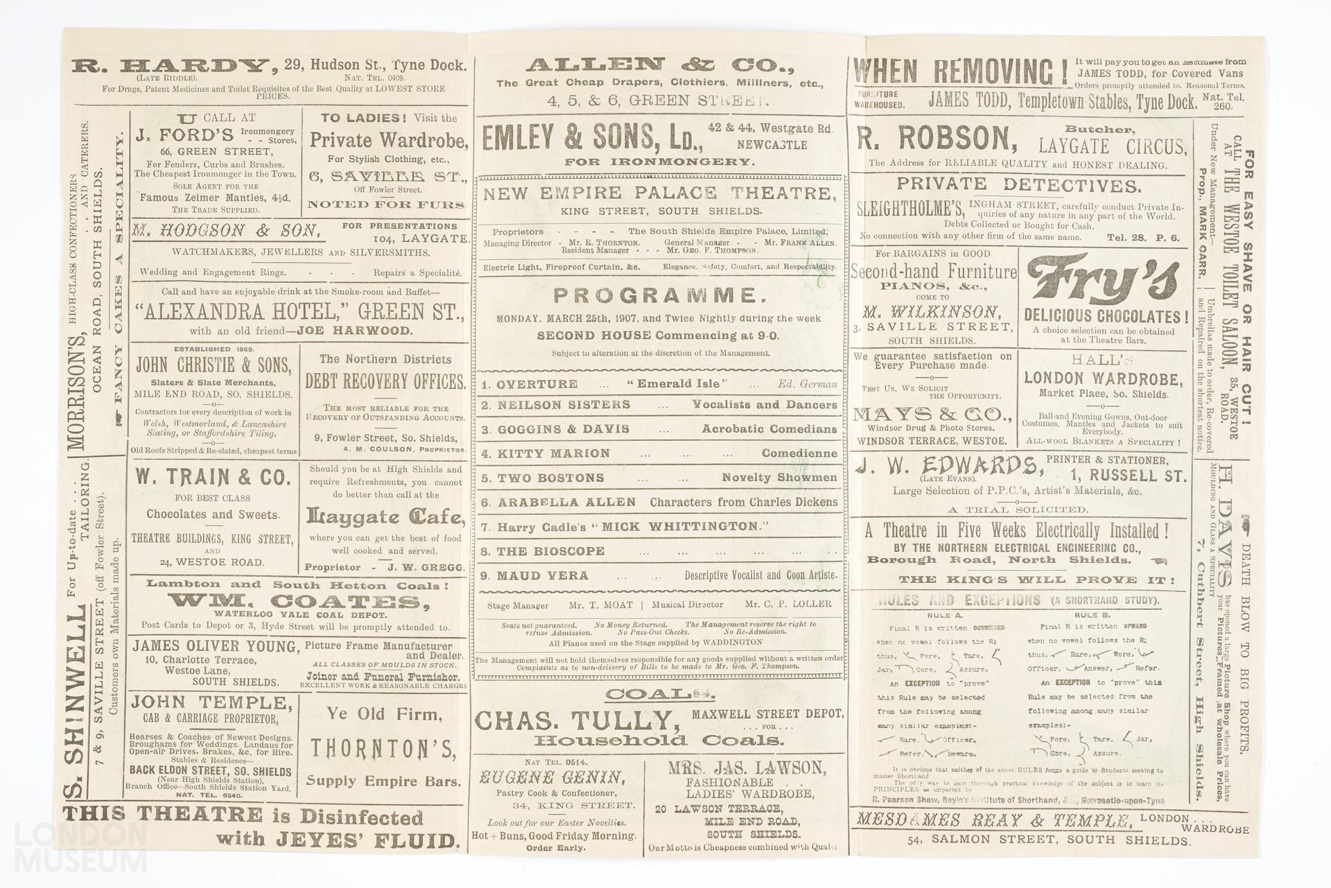 Theatre programme for the Empires Palace Theatre, South Shields. The programme is folded into three sections and printed in shades of green which includes illustrations of the interior of the theatre. The programme lists the performers appearing during the week including the suffragette Kitty Marion.