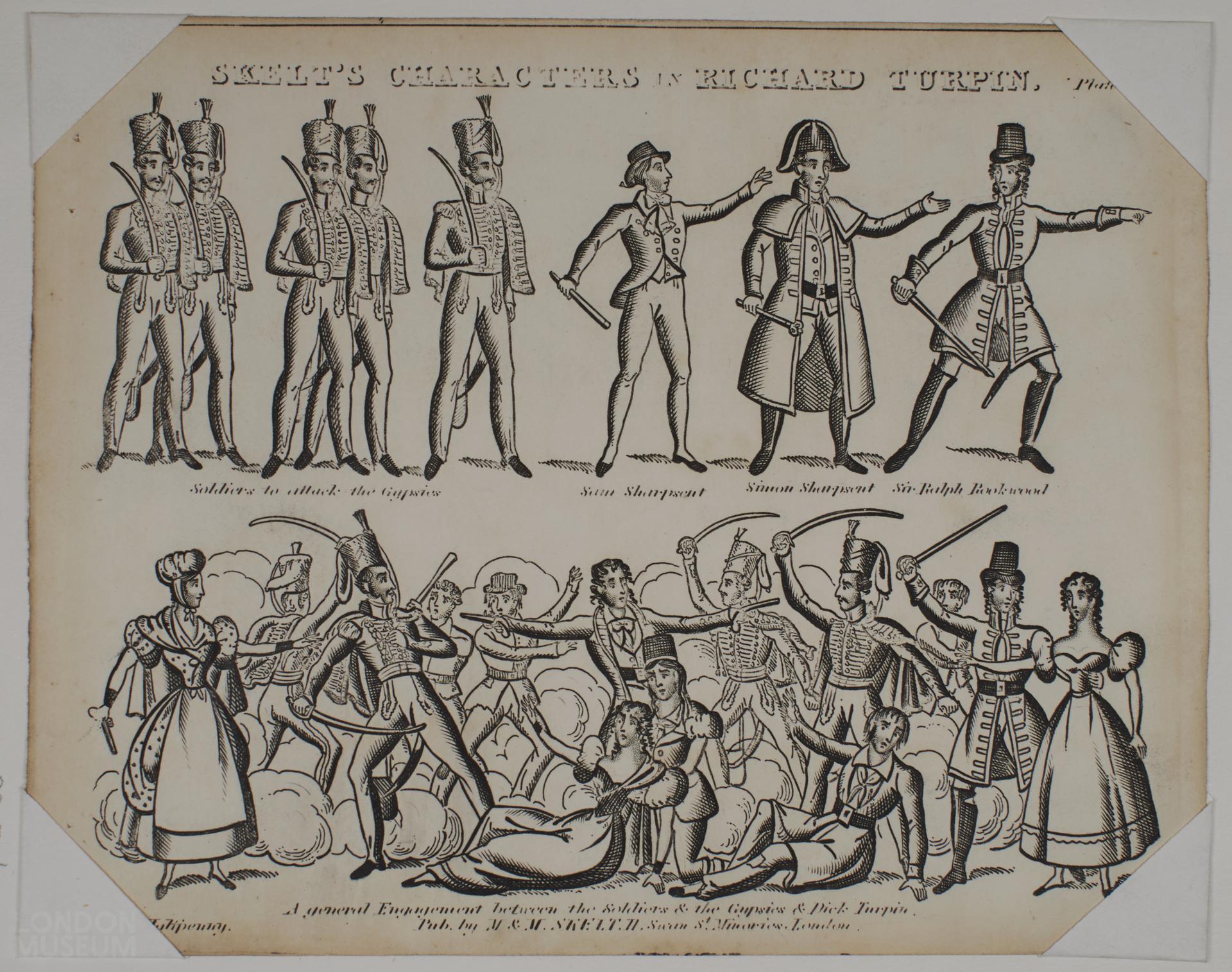 Toy theatre character sheet relating to the play 'Richard Turpin', Plate 9. Published by Martin and Matthew Skelt, 11 Swan Street, Minories, London.