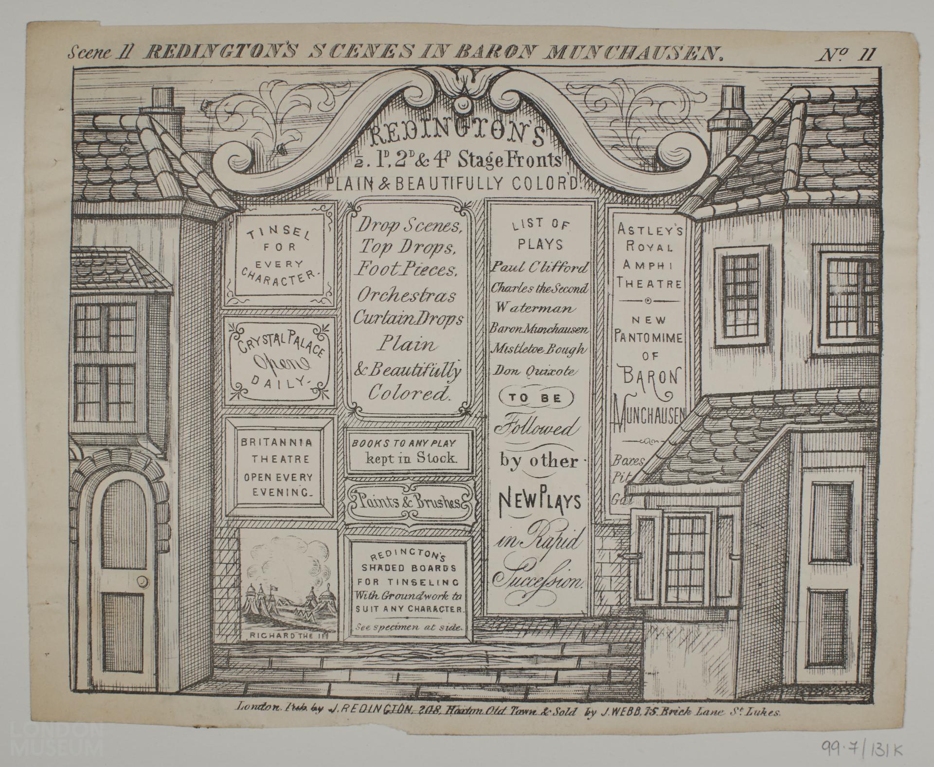 Toy theatre scenery sheet, one of thirty-seven sheets relating to the play 'Baron Munchausen'. Scene 11, No. 11. Published by J. Redington, 208 Hoxton Old Town. Sold by J. Webb, 75 Brick Lane, St Luke.