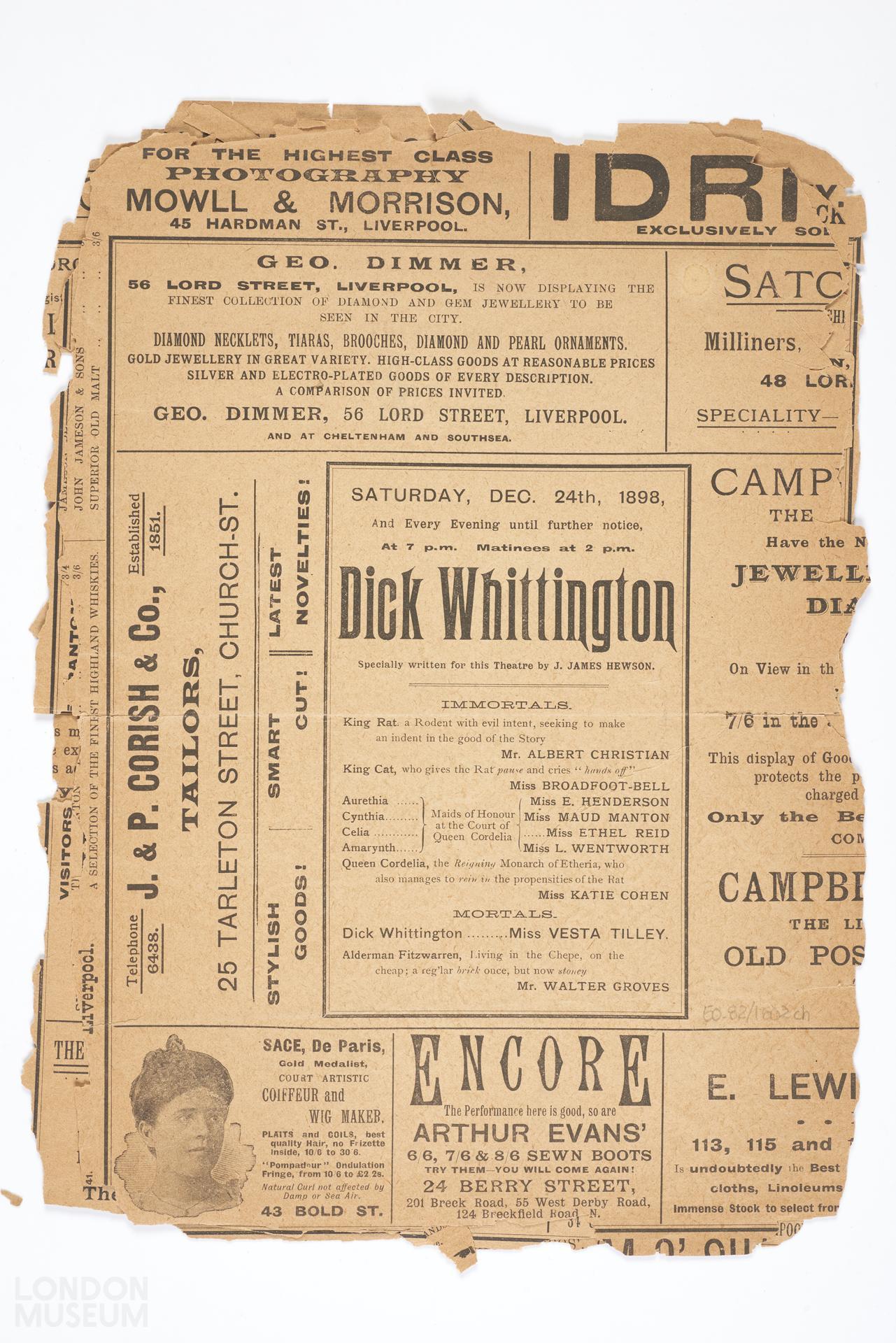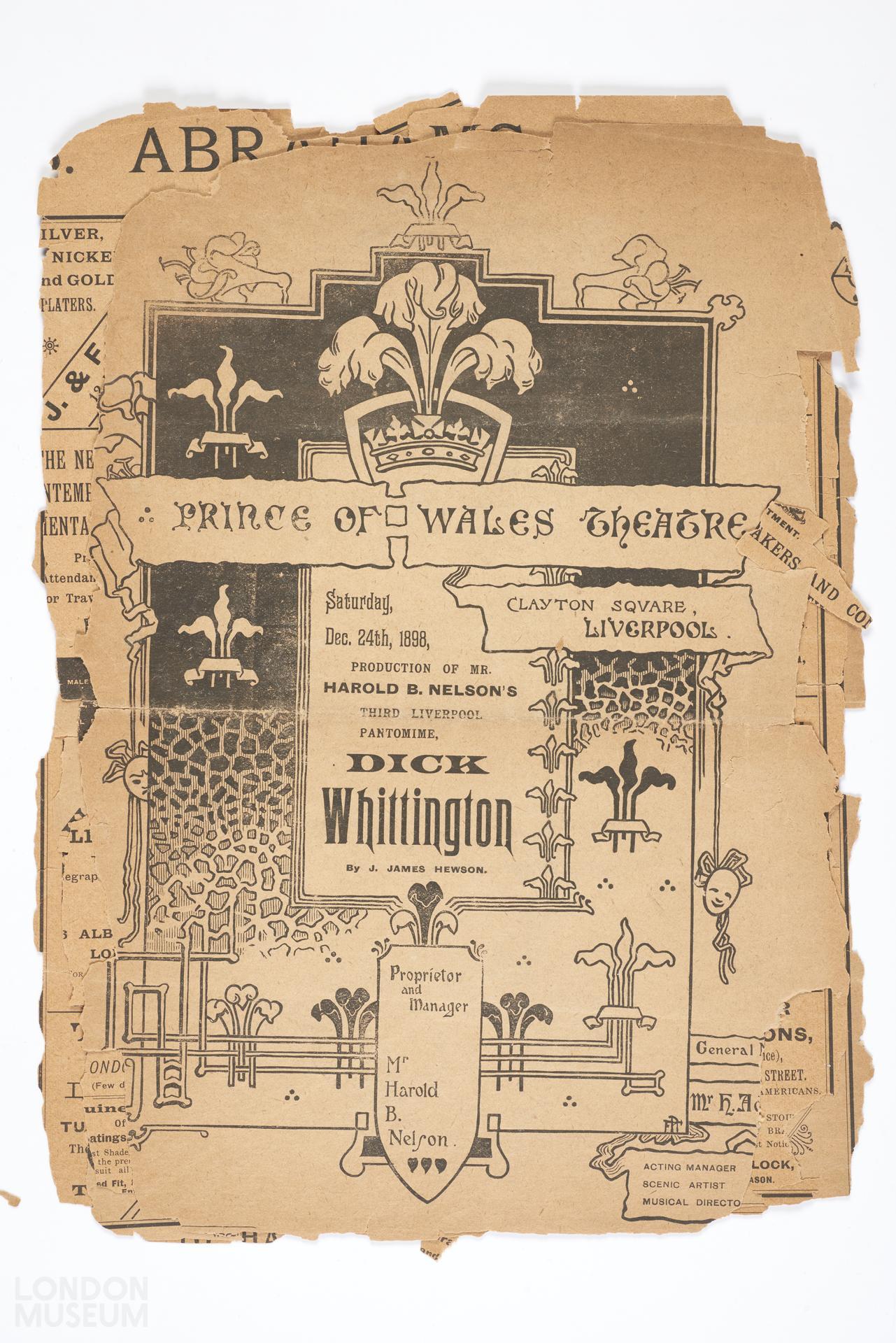 Programme for the pantomime Dick Whittington to be performed at the Prince of Wales Theatre, Liverpool, 1898.
