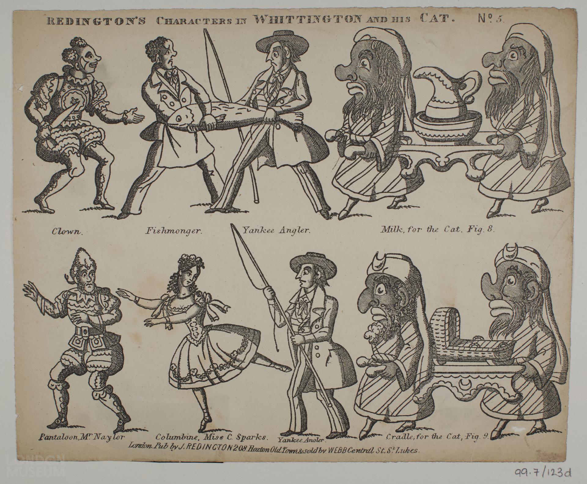 Toy theatre character sheet, one of fourty items relating to the play 'Whittington and his Cat'. No. 5. Published by J.Redington but copied from plates originally published by John Kirby Green for whom Redington was agent. Sold by J. Webb, Central St, St Lukes.