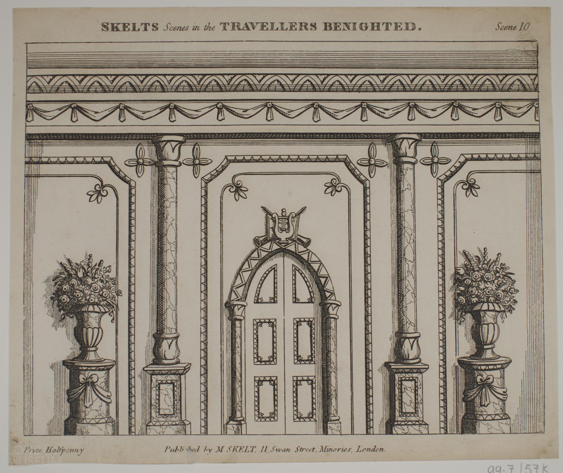 Toy theatre scenery sheet relating to the play 'The Travellers Benighted', Scene 10. Published by Martin Skelt, 11 Swan Street, Minories, London. Sold for 1/2d each sheet.