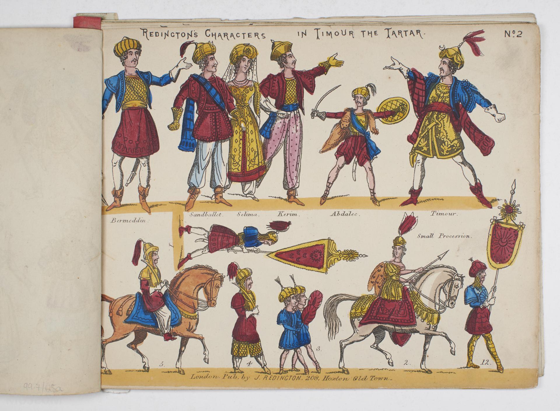 Coloured toy theatre character sheet, one of twenty-four items relating to the play 'Timour the Tartar'. No. 2. Published by J.Redington 73 Hoxton Street.