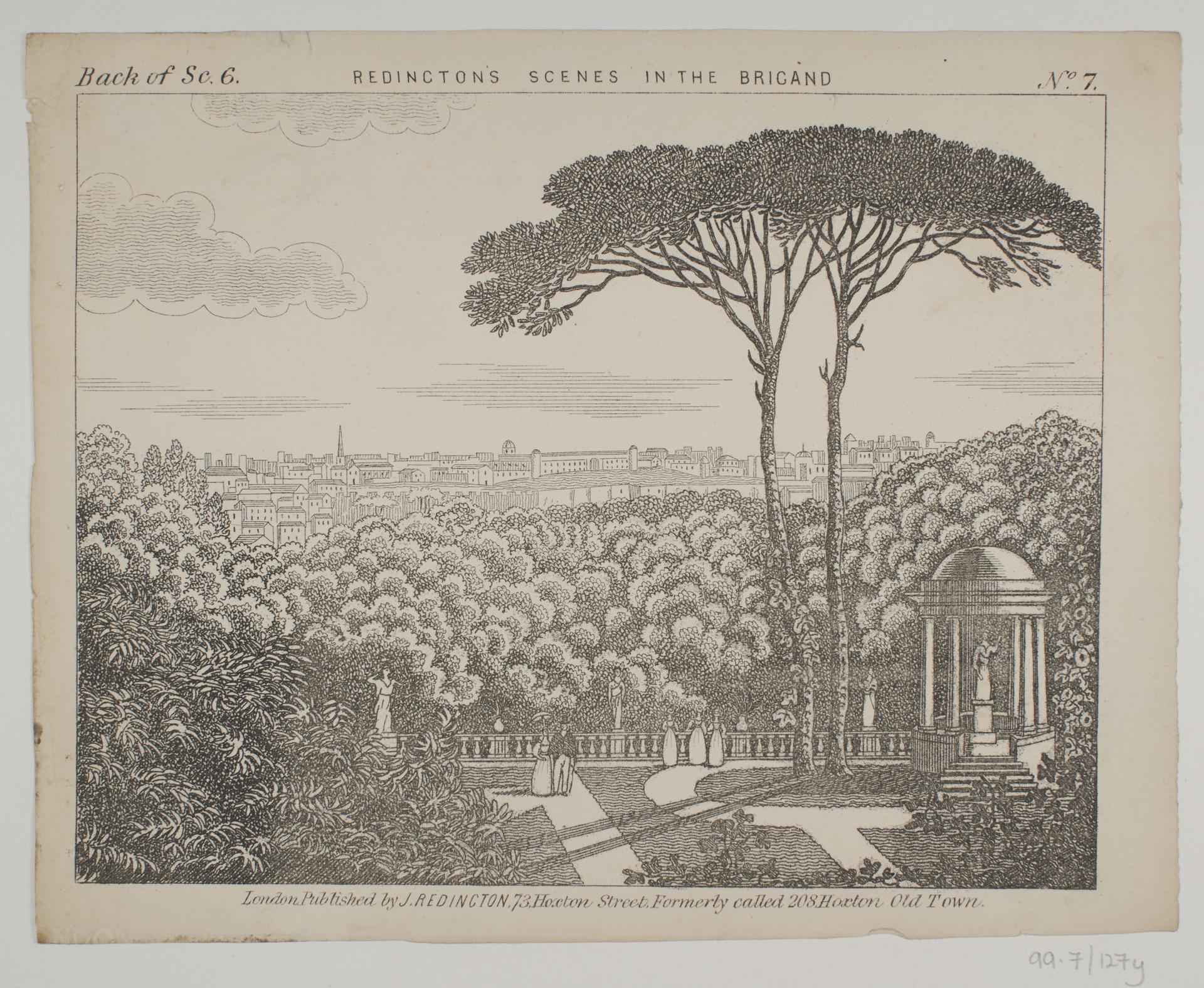Toy theatre scenery sheet, one of twenty-eight items relating to the play 'The Brigand'. Back of scene 6, No. 7. Published by J.Redington 73 Hoxton Street.