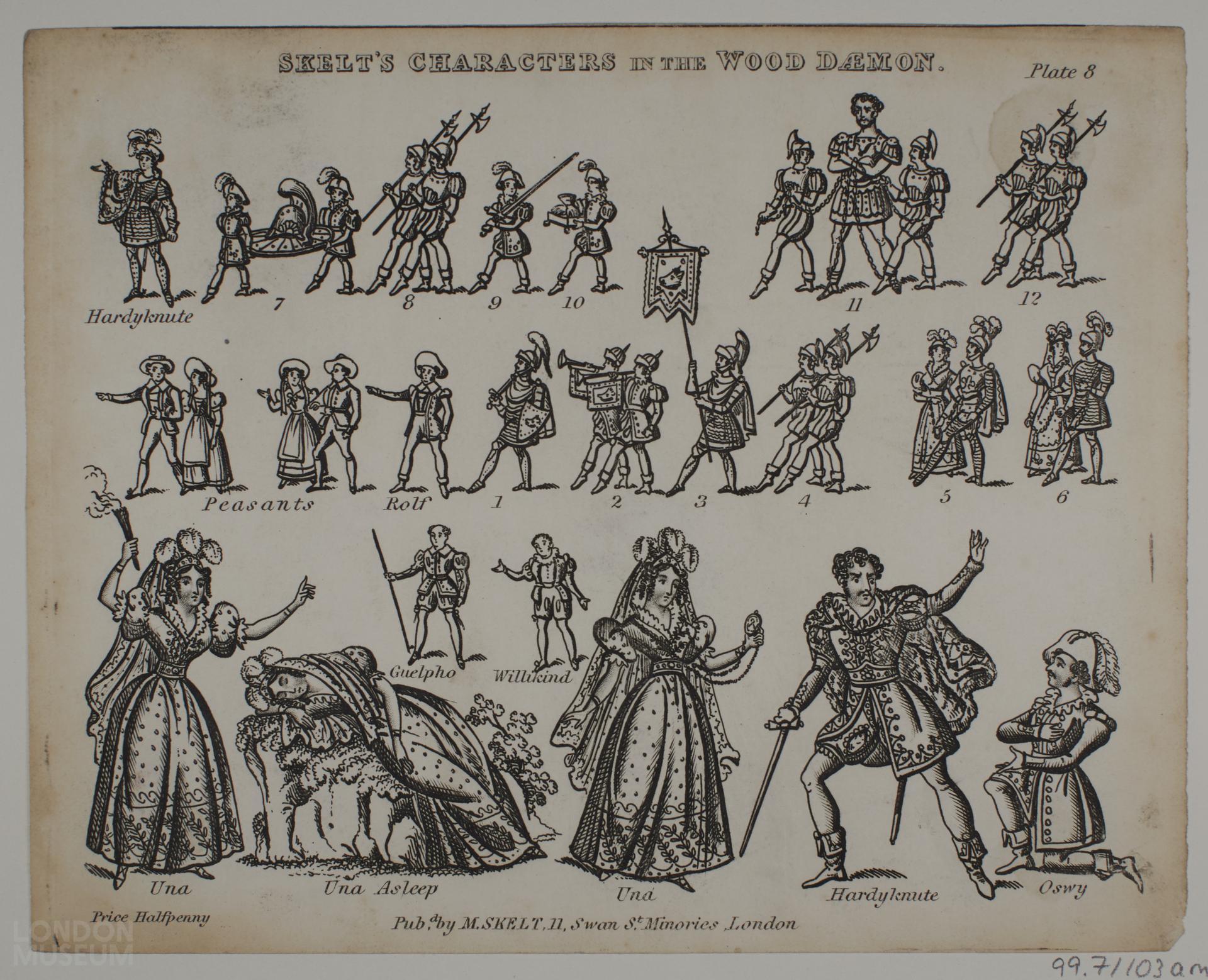 Printed, black and white Skelt's scene. Plate 8. Titled 'Skelt's Characters in the Wood Daemon'.