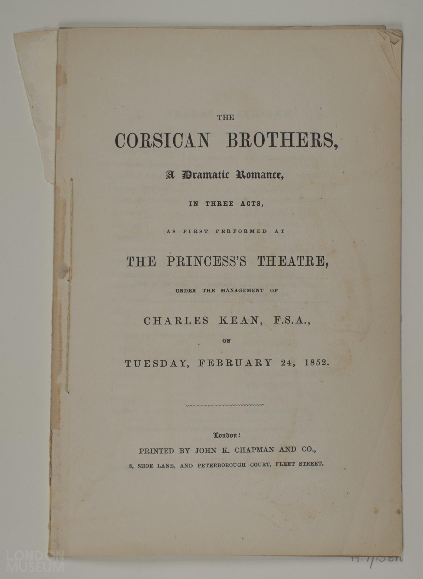 Toy theatre playbook, one of ten items relating to the play 'The Corsican Brothers'. 39 numbered pages. As first performed at The Princess's Theatre under the management of Charles Kean on Tuesday February 24, 1852. Printed by John K. Chapman and Co.