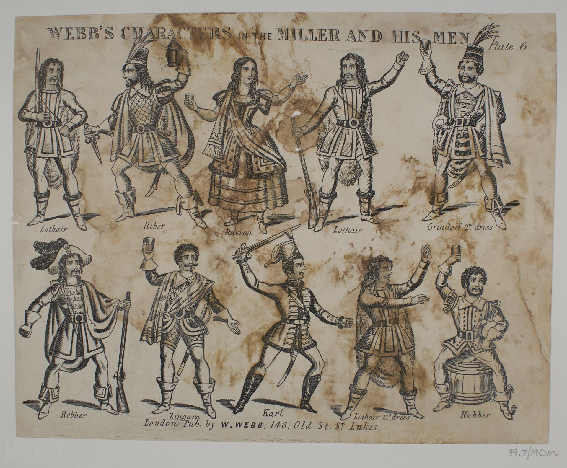 Seventy toy theatre sheets relating to the play 'The Miller & his Men' and one copy of the associated playbook published by H.J.Webb as part of the Webb's Juvenile Drama series. The sheets comprise 17 uncoloured character plates including a complete set of 9 and 8 duplicate sheets. Twenty eight scenery plates including a complete set of 11, 17 duplicate and 11 coloured sheets. Seventeen side wings plates including a complete set of 4, 8 coloured and 13 duplicate sheets. Also 1 uncoloured water piece sheet, 4 identical set piece sheets (1 coloured) and 3 large coloured scenery plates (315 mm x 240 mm) numbered 5,7 & 8.