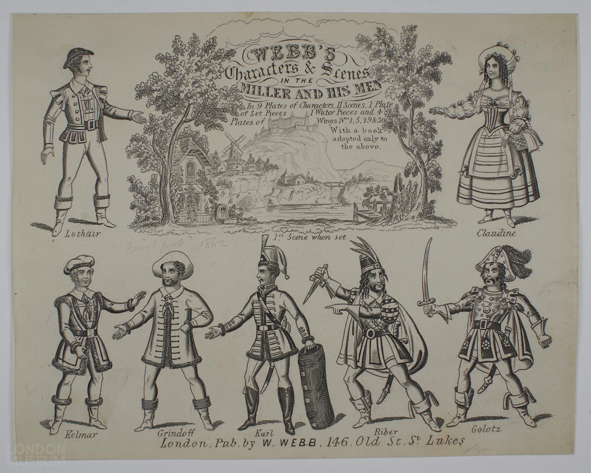Seventy toy theatre sheets relating to the play 'The Miller & his Men' and one copy of the associated playbook published by H.J.Webb as part of the Webb's Juvenile Drama series. The sheets comprise 17 uncoloured character plates including a complete set of 9 and 8 duplicate sheets. Twenty eight scenery plates including a complete set of 11, 17 duplicate and 11 coloured sheets. Seventeen side wings plates including a complete set of 4, 8 coloured and 13 duplicate sheets. Also 1 uncoloured water piece sheet, 4 identical set piece sheets (1 coloured) and 3 large coloured scenery plates (315 mm x 240 mm) numbered 5,7 & 8.