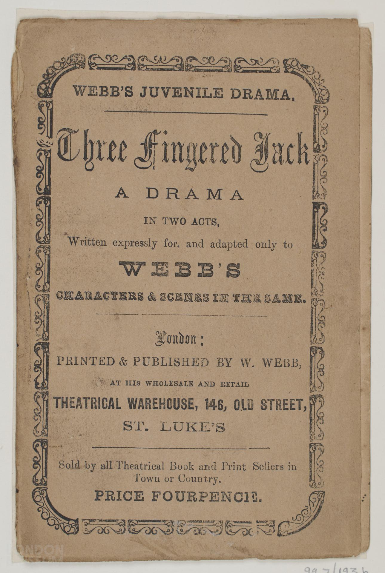Toy theatre playbook, one of fifty-four items relating to the play 'Three Fingered Jack'. Published by W. Webb 146 Old Street, St Luke's.
