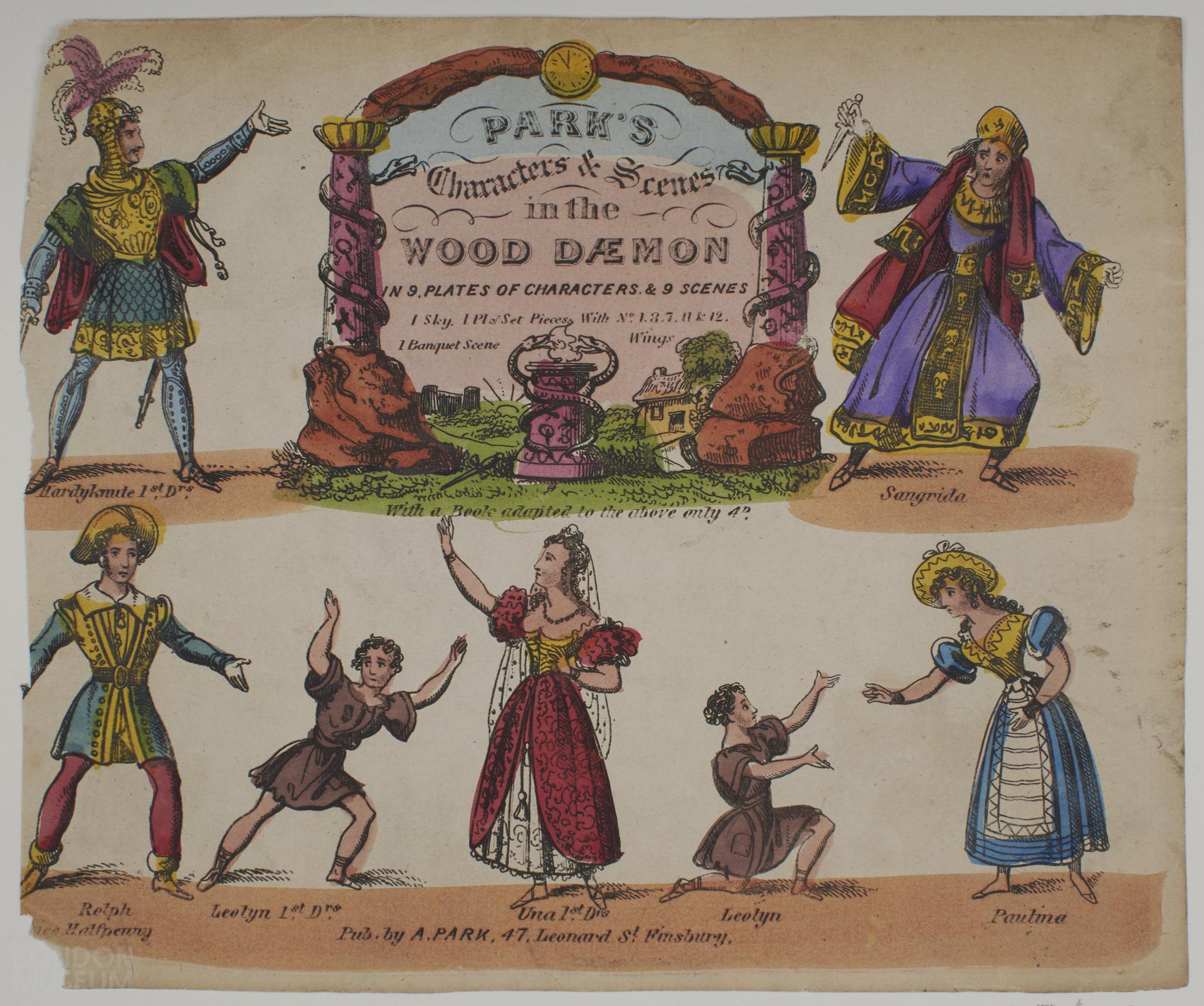 Toy theatre character sheet for the play 'The Wood Daemon or the Hour of One', Plate 1. Published by Archibald Alexander Park, 47 Leonard Street, London EC2.