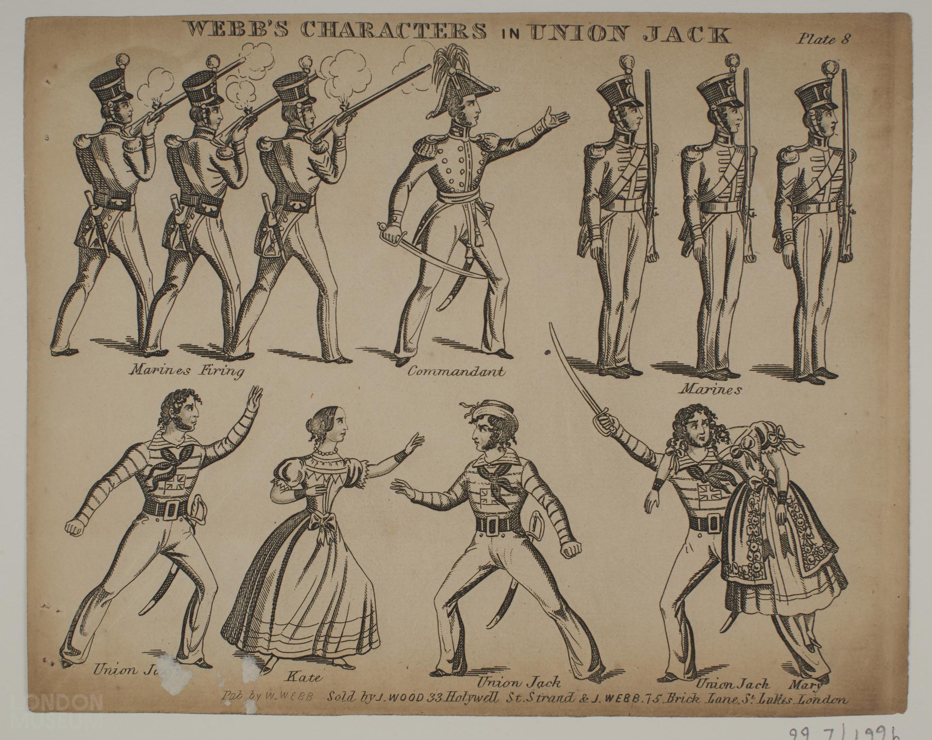 Toy theatre character sheet, one of thirty-four items relating to the play 'Union Jack'. Plate 8. Published by W. Webb. Sold by J. Wood 33 Holywell St. Strand & J. Webb 75 Brick Lane St Lukes, London.