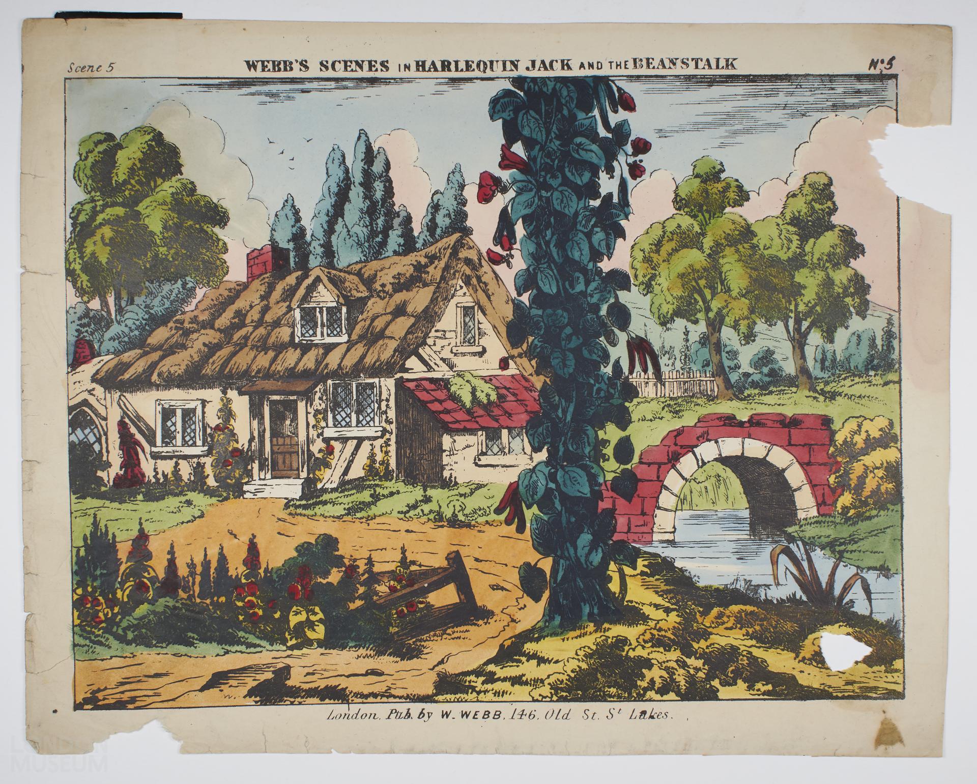 Coloured toy theatre scenery sheet, one of fourty-three items relating to the play 'Harlequin Jack and the Beanstalk'. Scene 5, No. 5. Published by W. Webb 146 Old Street St Luke's.