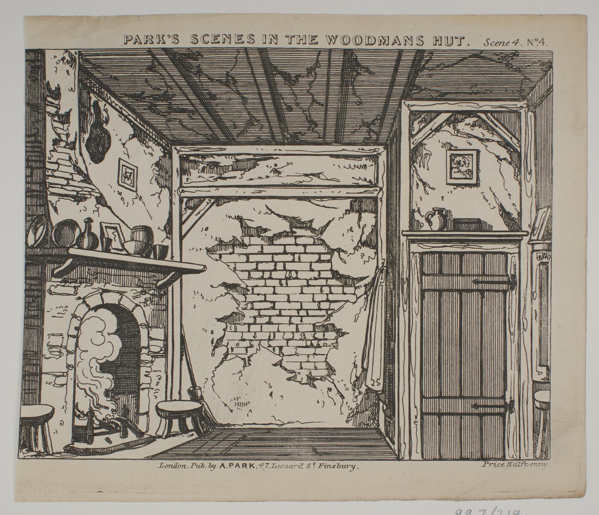 Toy theatre scenery sheet for the play 'Woodman's Hut or the Burning Forest', Scene 4, No. 4. Published by Archibald Alexander Park, 47 Leonard Street, London EC2. Price halfpenny.