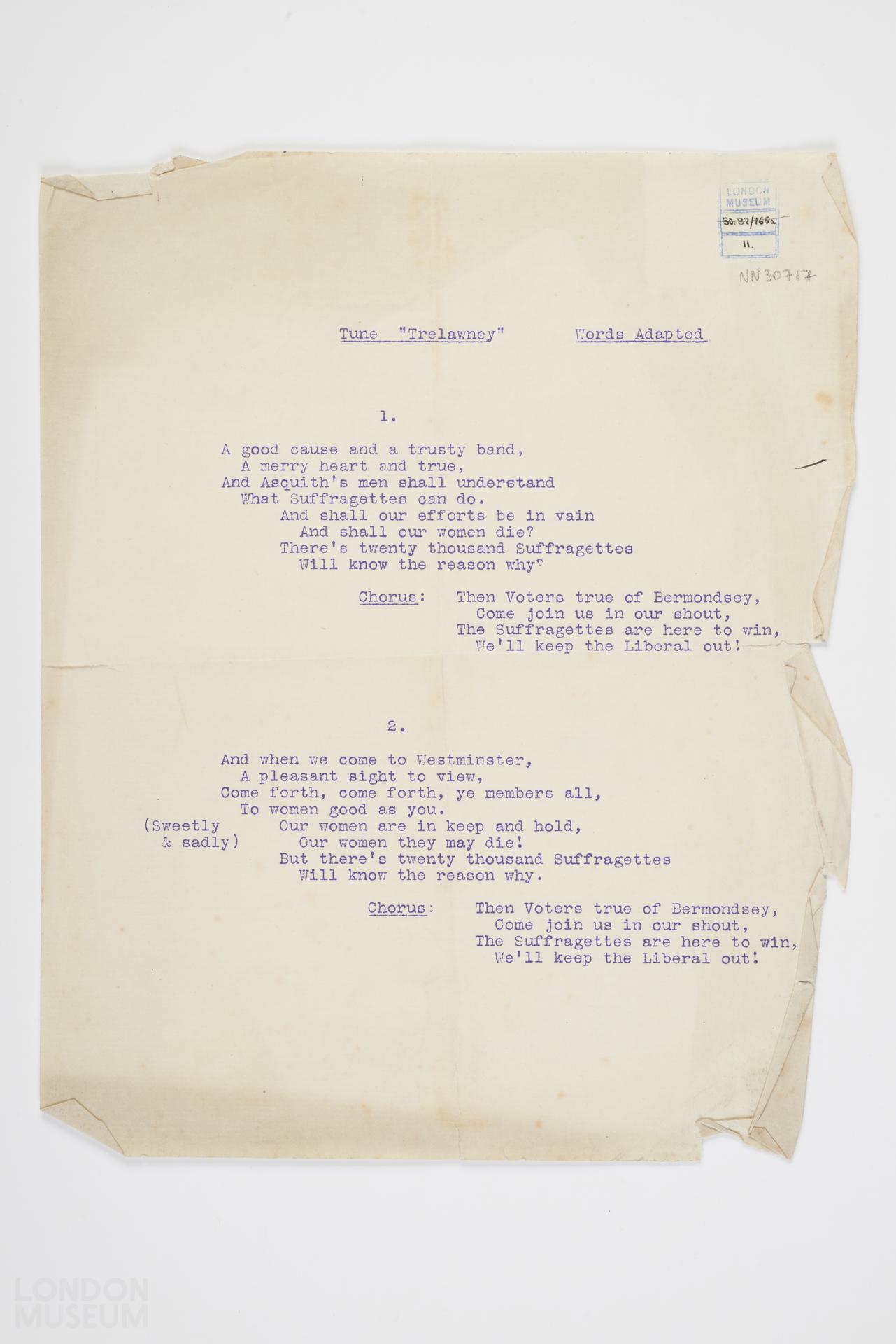 Sheet printed with the words (only) of a suffragette marching song, to the tune of "Trelawney". Printed in blue on a cream sheet of paper.