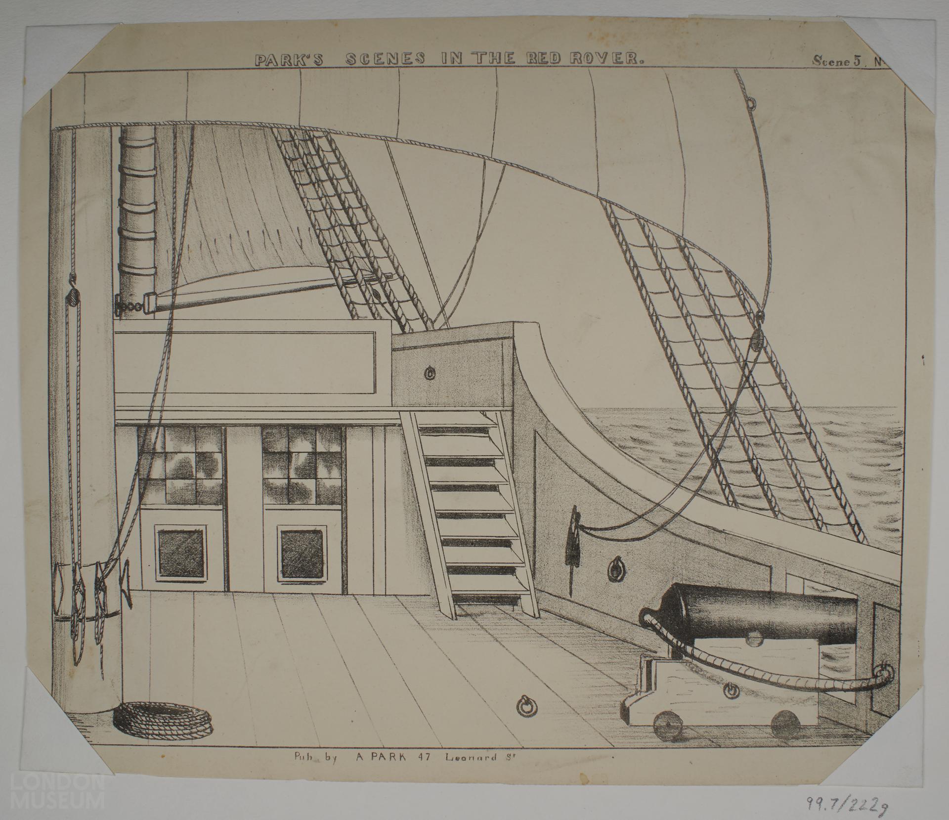 Large toy theatre scenery sheet relating to the play 'Red Rover. Scene 5, No. 7. Published by Archibald Alexander Park, 47 Leonard Street, London EC2.