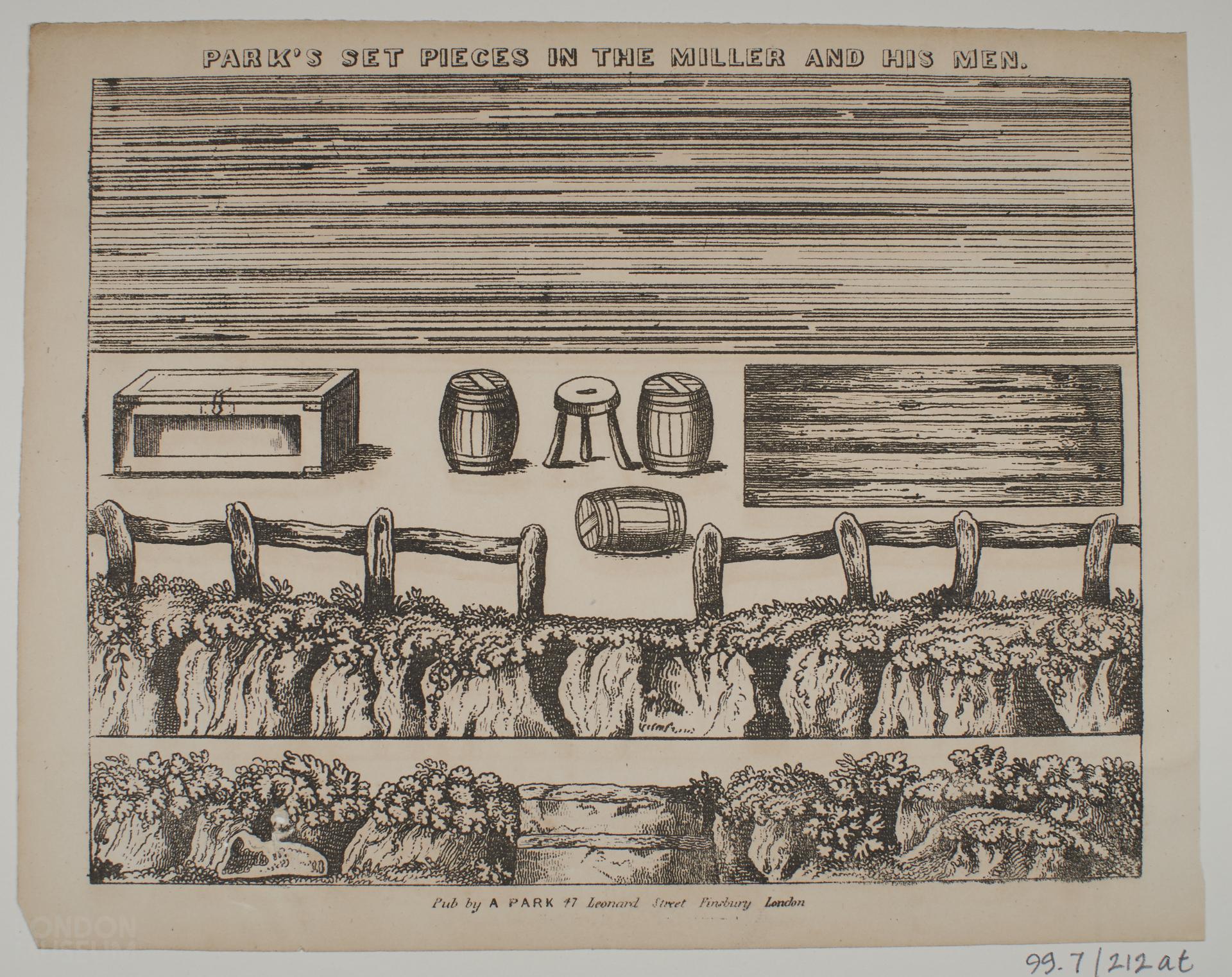 Printed black and white scenery sheet, titled Park's Set Pieces in the Miller and his Men.