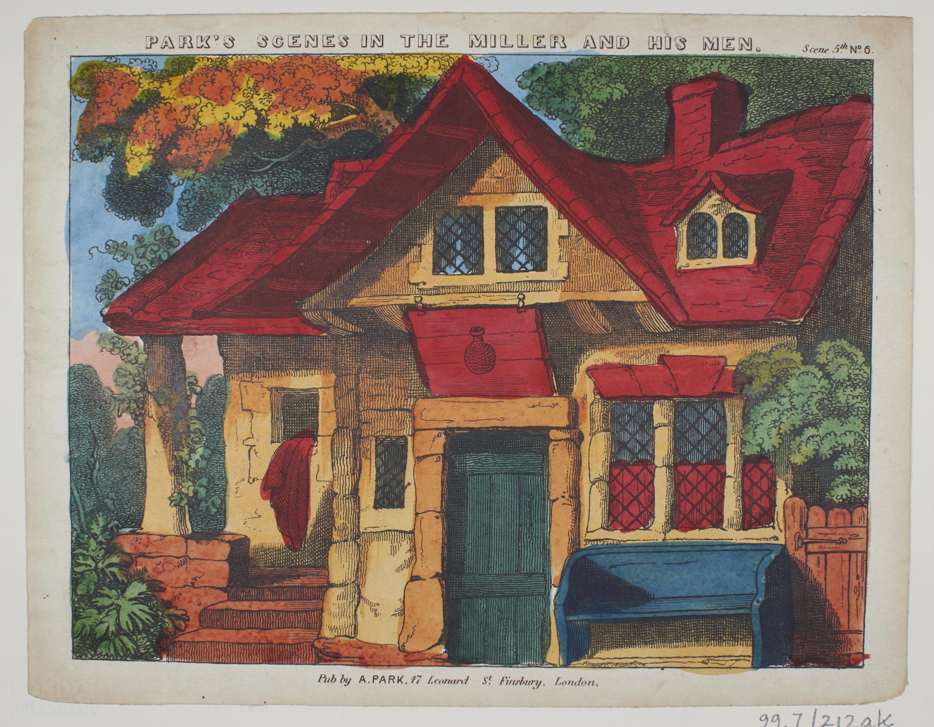 Printed colour scenery sheet titled 'Park's Scenes in The Miller and his Men' scene 5th, No 5.