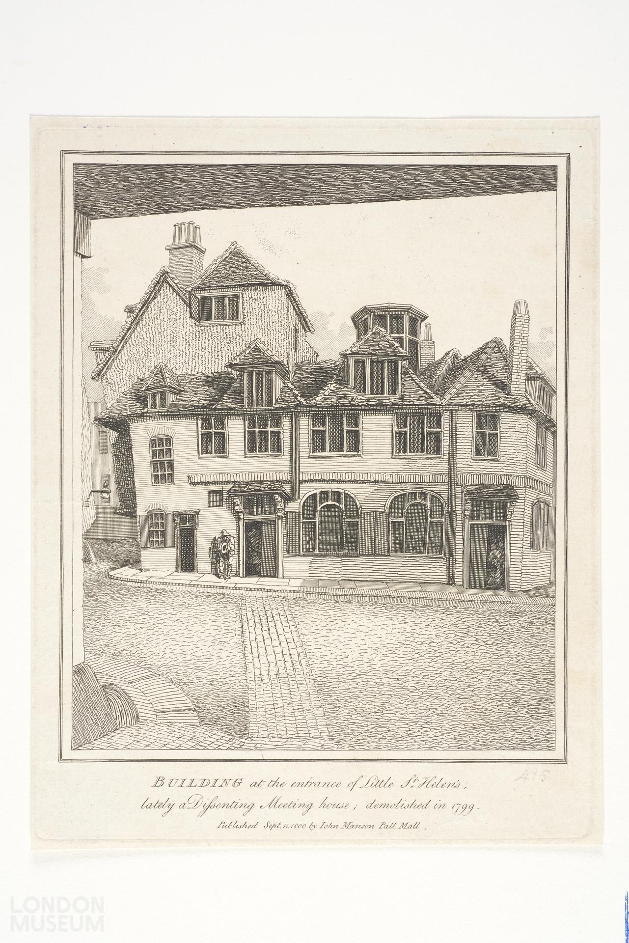 Building at the entrance of Little St Helen's lately a Dissenting Meeting house; demolished in 1799. Dissenting Meeting House, near Little St Helen's, 1800. This lay on the east side of Bishopsgate Street leading to Leathersellers' Hall, etc. It was rebuilt more regularly in 1799 as St. Helen's Place, but continued also to be called "Little St. Helen's" for some years. It was called "Little St. Helen's" because it pertained to the Nuns of St. Helen's and was their house.