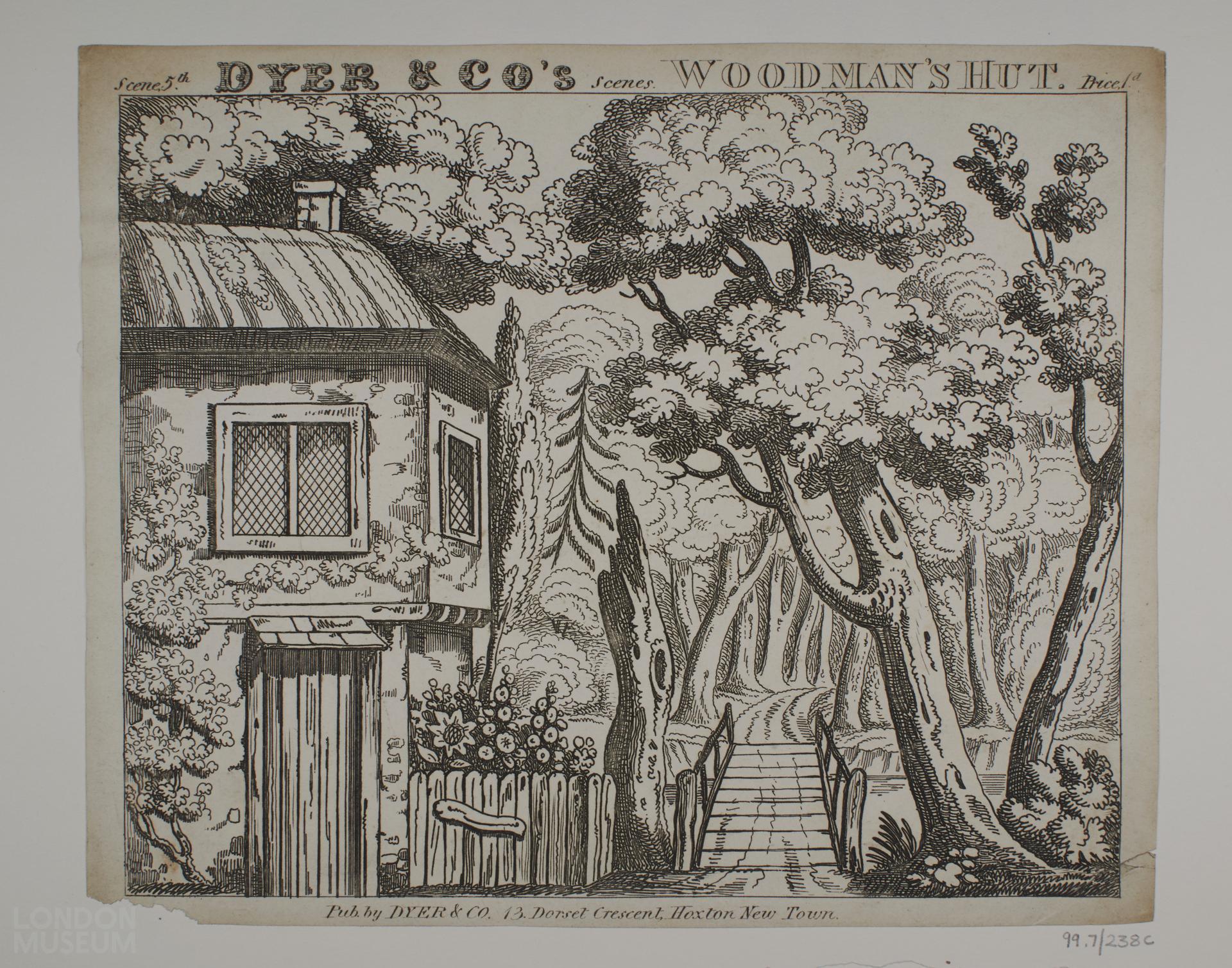 Toy theatre scenery sheet, one of six items relating to the play 'Woodman's Hut'. Scene 5. Published by Dyer & Co. 13 Dorset Crescent Hocton New Town.